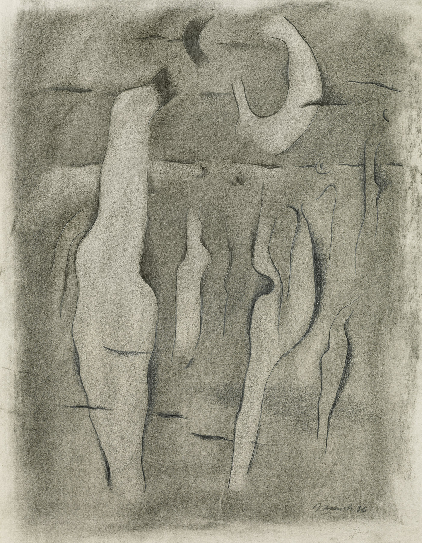 Kohle, gewischt, Bleistift, fixiert, Konturen mit hartem Bleistift vorgeritzt, auf chamoisfarbigem, am Rand l. perforiertem Zeichenkarton