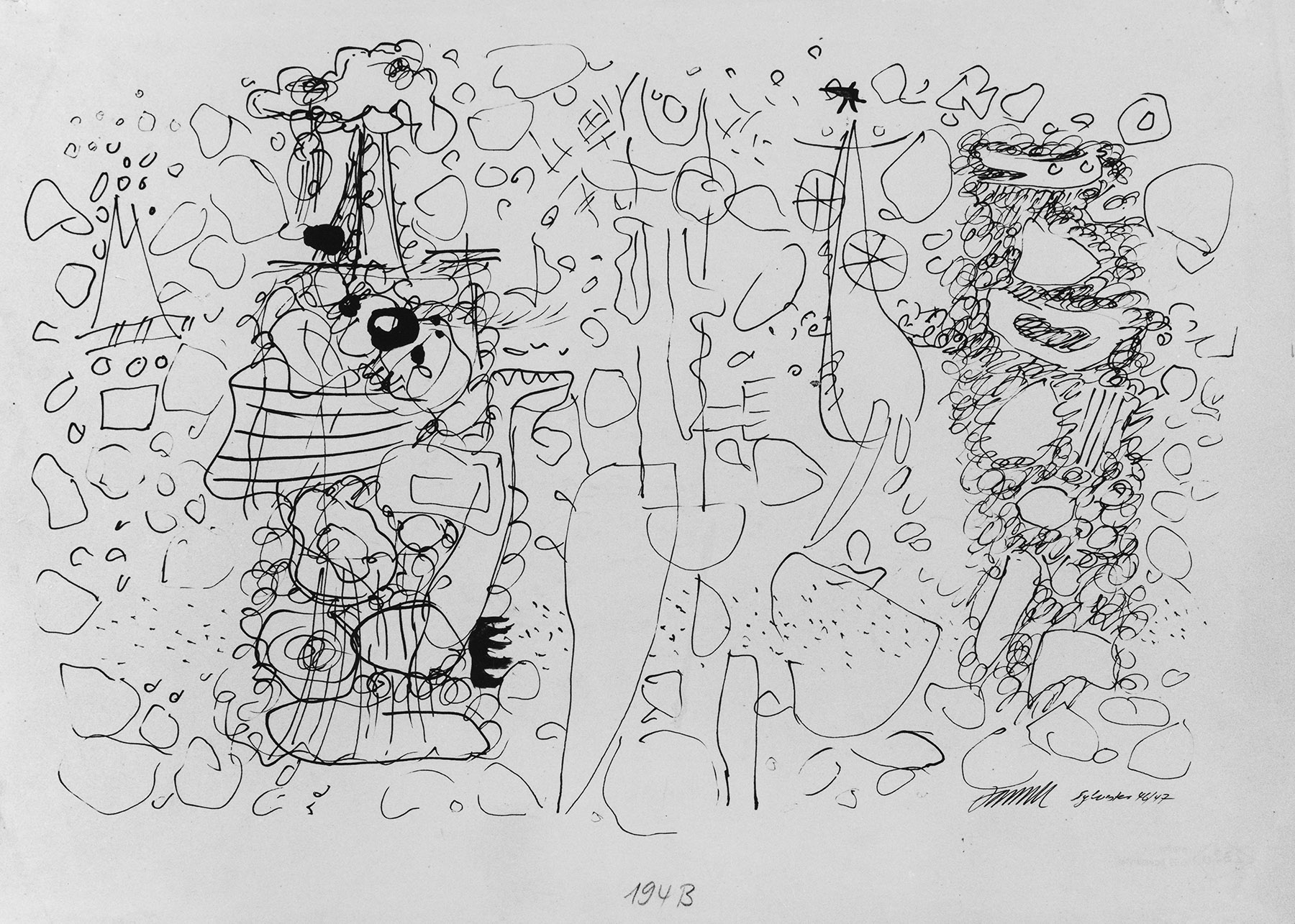 Feder und Pinsel in Tusche in Schwarz, auf chamois-farbigem, durchscheinendem Schreibpapier mit Wz. o.: DYNAMIK . HARTPOST