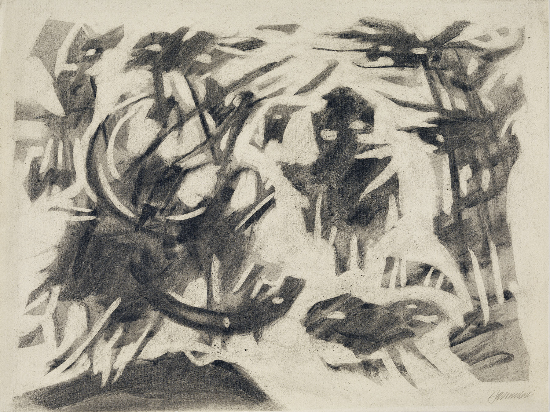 Kohle, gewischt, radiert, fixiert, auf chamoisfarbigem, am Rand l. leicht unregelmäßig gerissenem Zeichenpapier