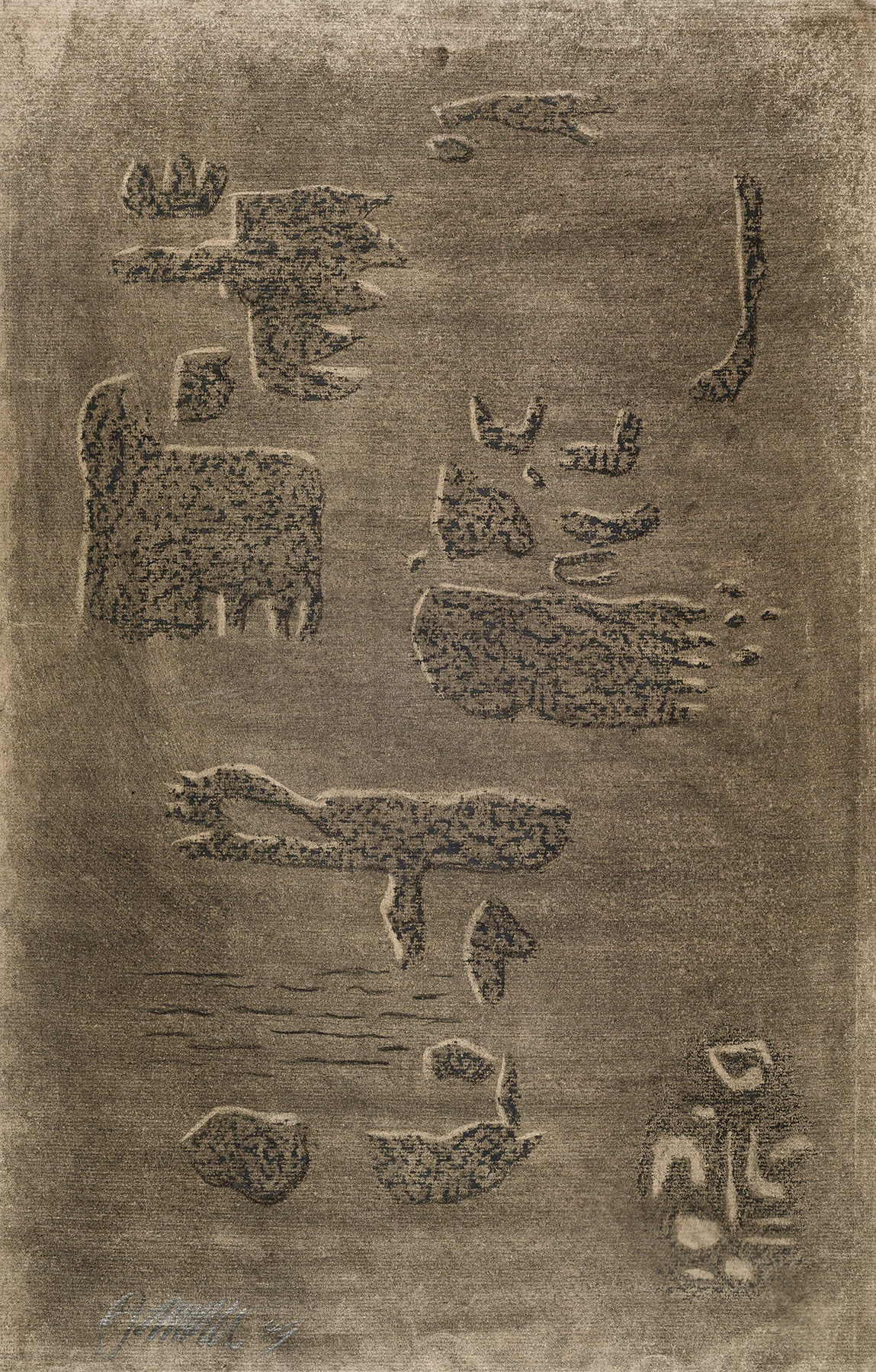 Kohle, gewischt, radiert, Ölkreide in Schwarz, durchgerieben, fixiert, auf mittelbraunem Ingres-Bütten mit Wz. r. o.: PMF (ITALIA)
