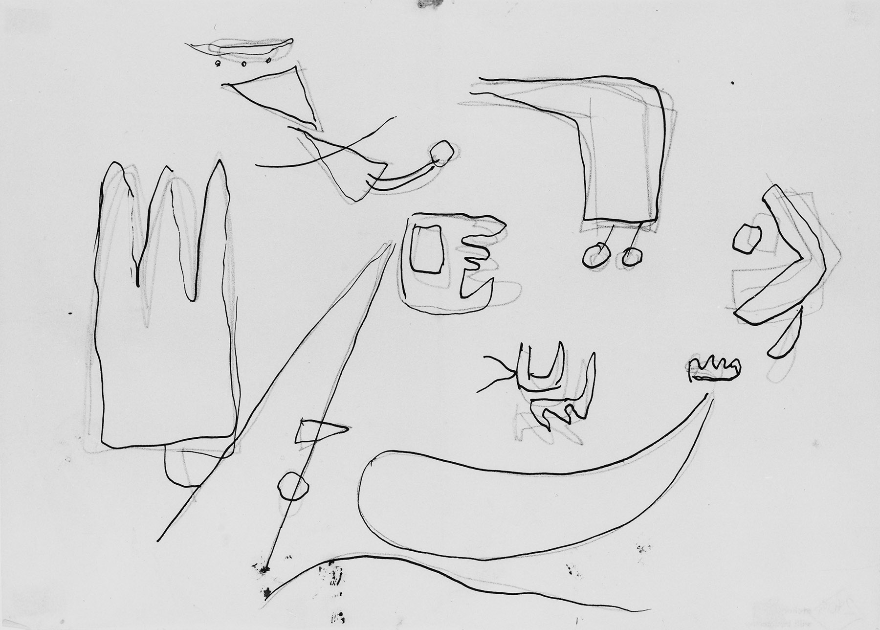 Bleistift, Feder in Tusche in Schwarz, auf chamoisfarbigem, stark durchscheinendem Schreibpapier (Durchschlagpapier)