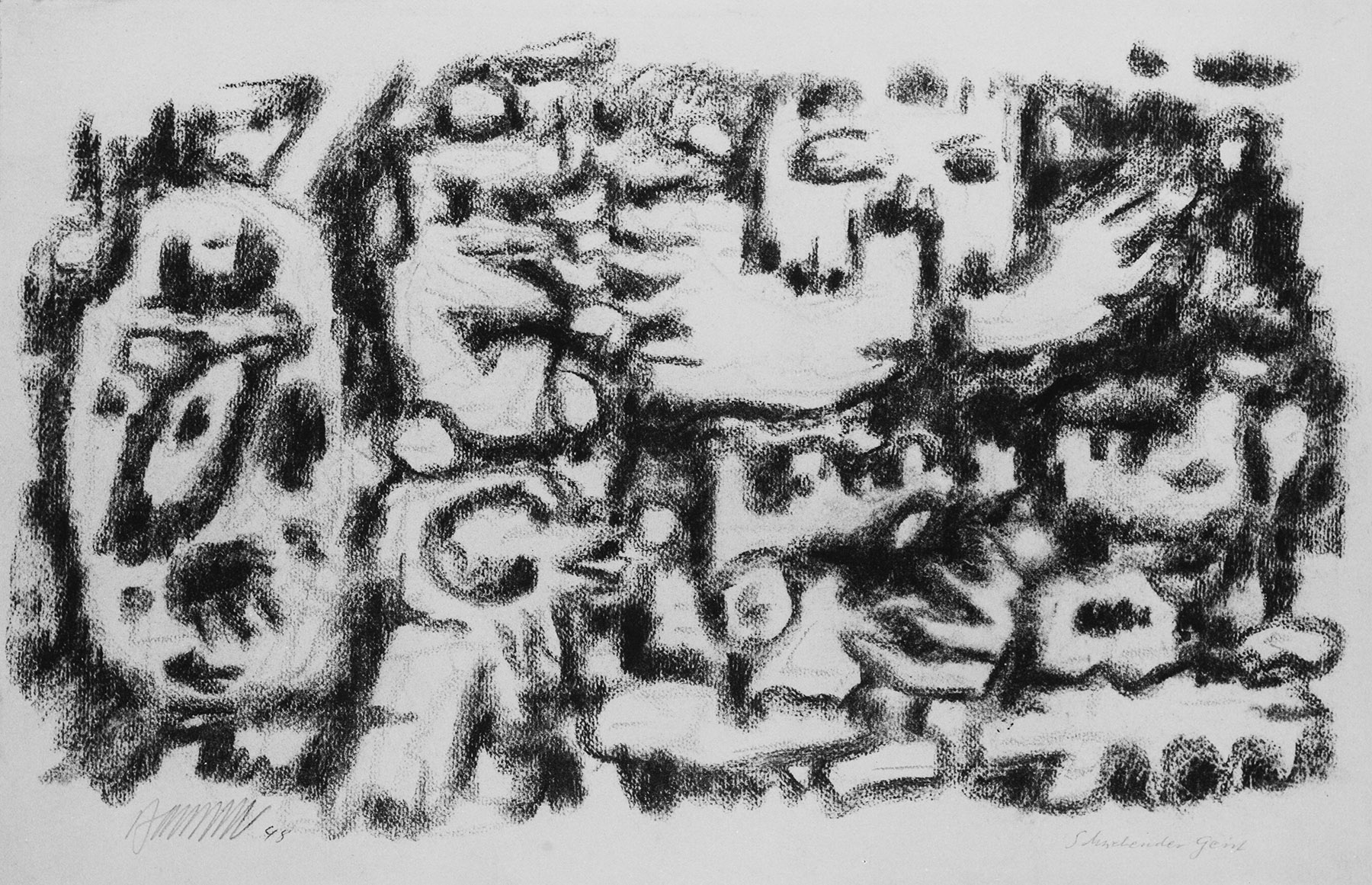 Kohle, Pastell in Ocker, fixiert, auf chamoisfarbigem Ingres-Bütten mit Wz. l. o.: ..NTGOLFIER FRANCE und r. u.: Kartusche