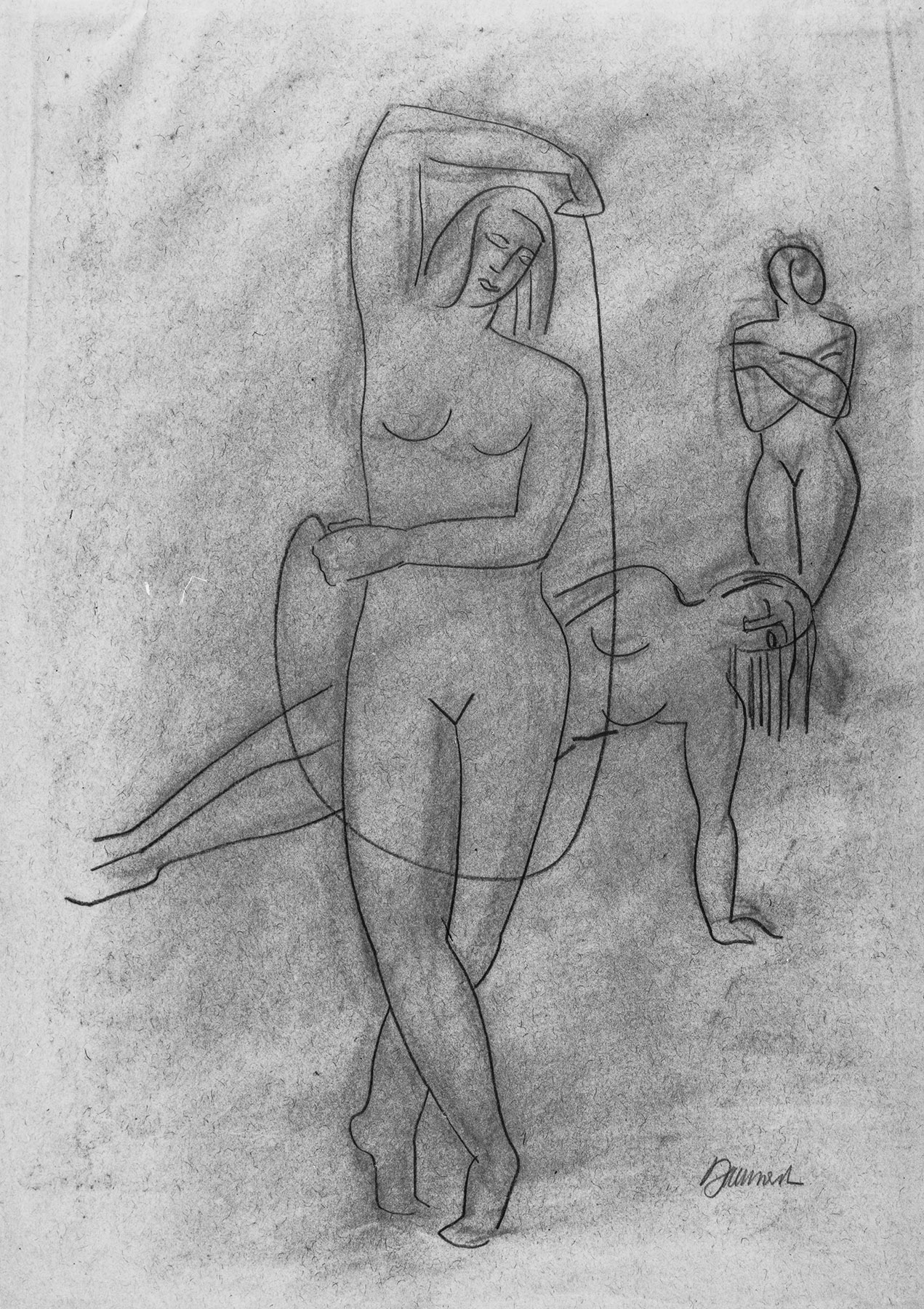 Kohle, gewischt, Bleistift, fixiert, auf türkisfarbenem Maschinen-Bütten (Vorsatzpapier), Wz. Mitte: Rosette