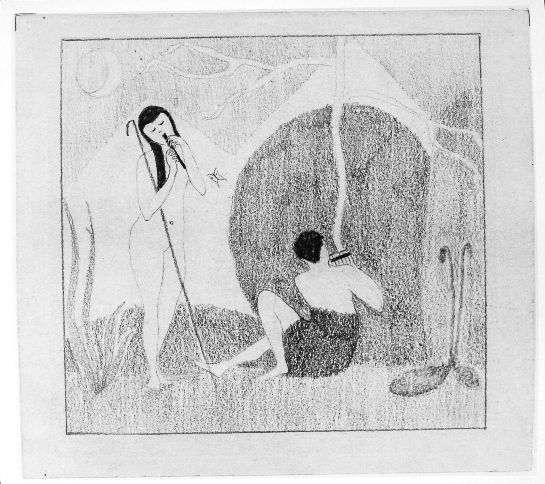Sitzender, die Panflöte spielend, und flötespielendes Mädchen