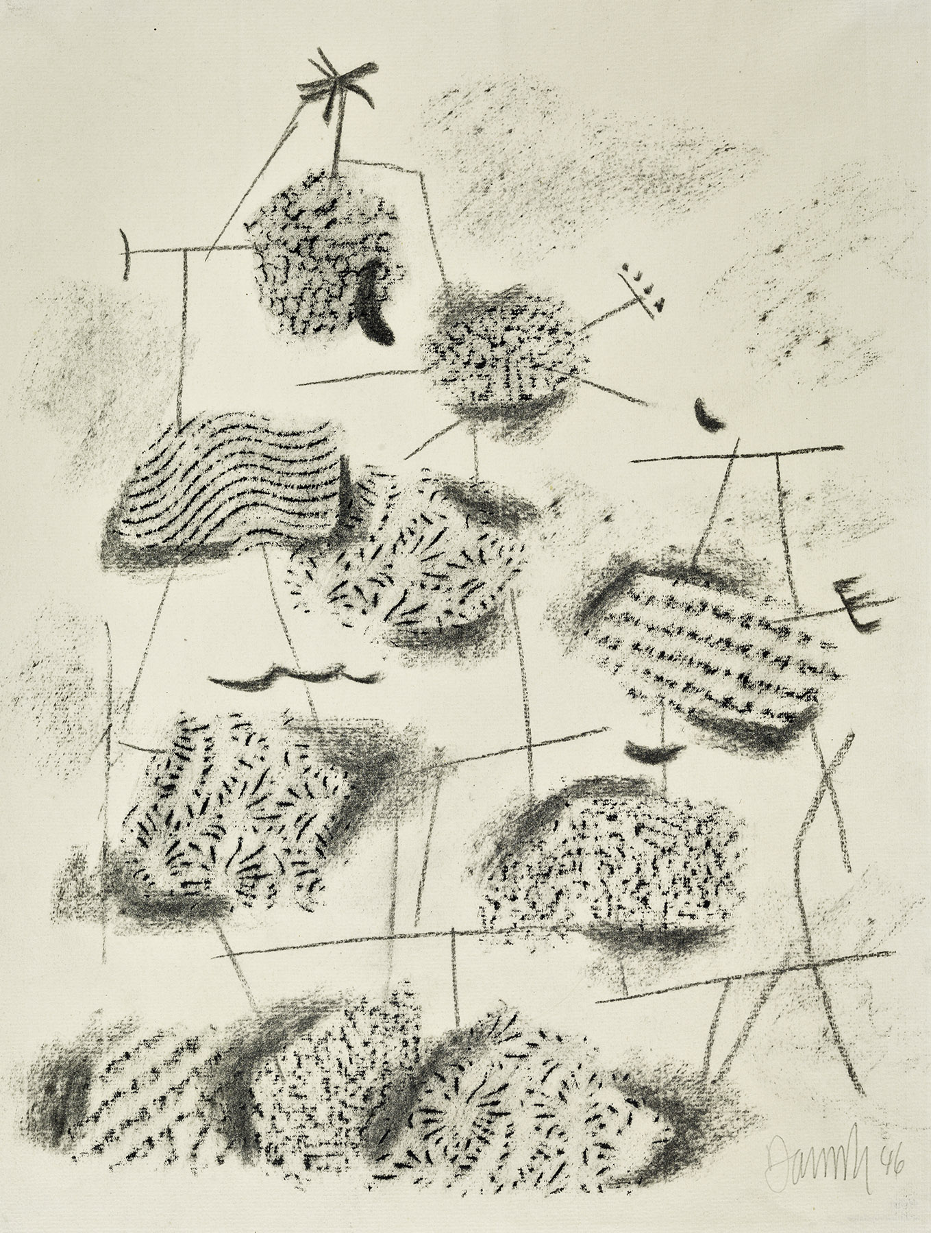 Kohle, gewischt, Ölkreide in Schwarz, z. T. durchgerieben, fixiert, auf chamoisfarbigem Ingres-Bütten