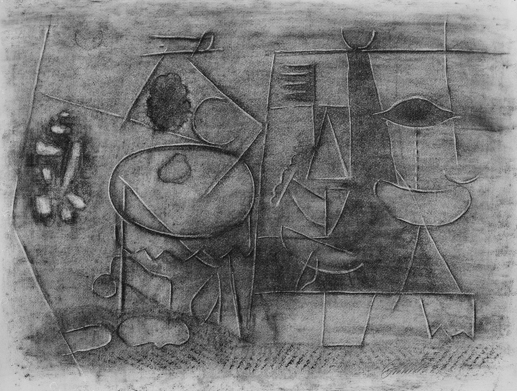 Kohle, gewischt, radiert, Ölkreide in Schwarz, fixiert, auf maisgelbem Ingres-Bütten mit Wz. u. Mitte: CANSON & MONTGOLFIER FRANCE, r. o.: INGRES und l. o.: Kartusche