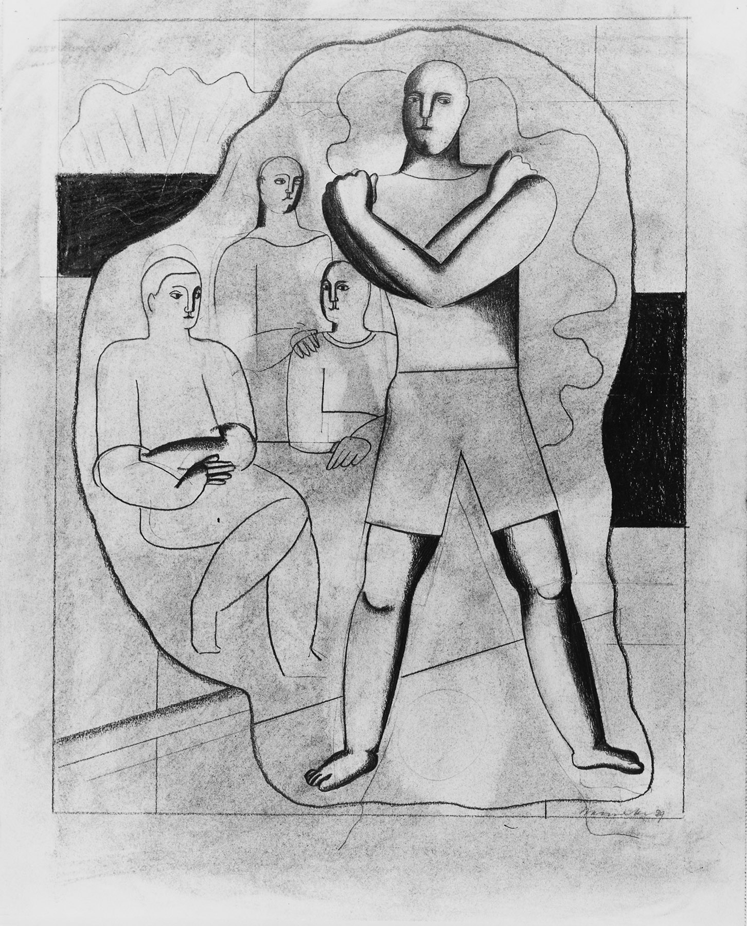 Kohle, gewischt, Bleistift, Ritzkonturen (Pentimenti), fixiert, Einfassungslinien, auf chamoisfarbigem, am Rand l., o. und r. perforiertem Zeichenkarton