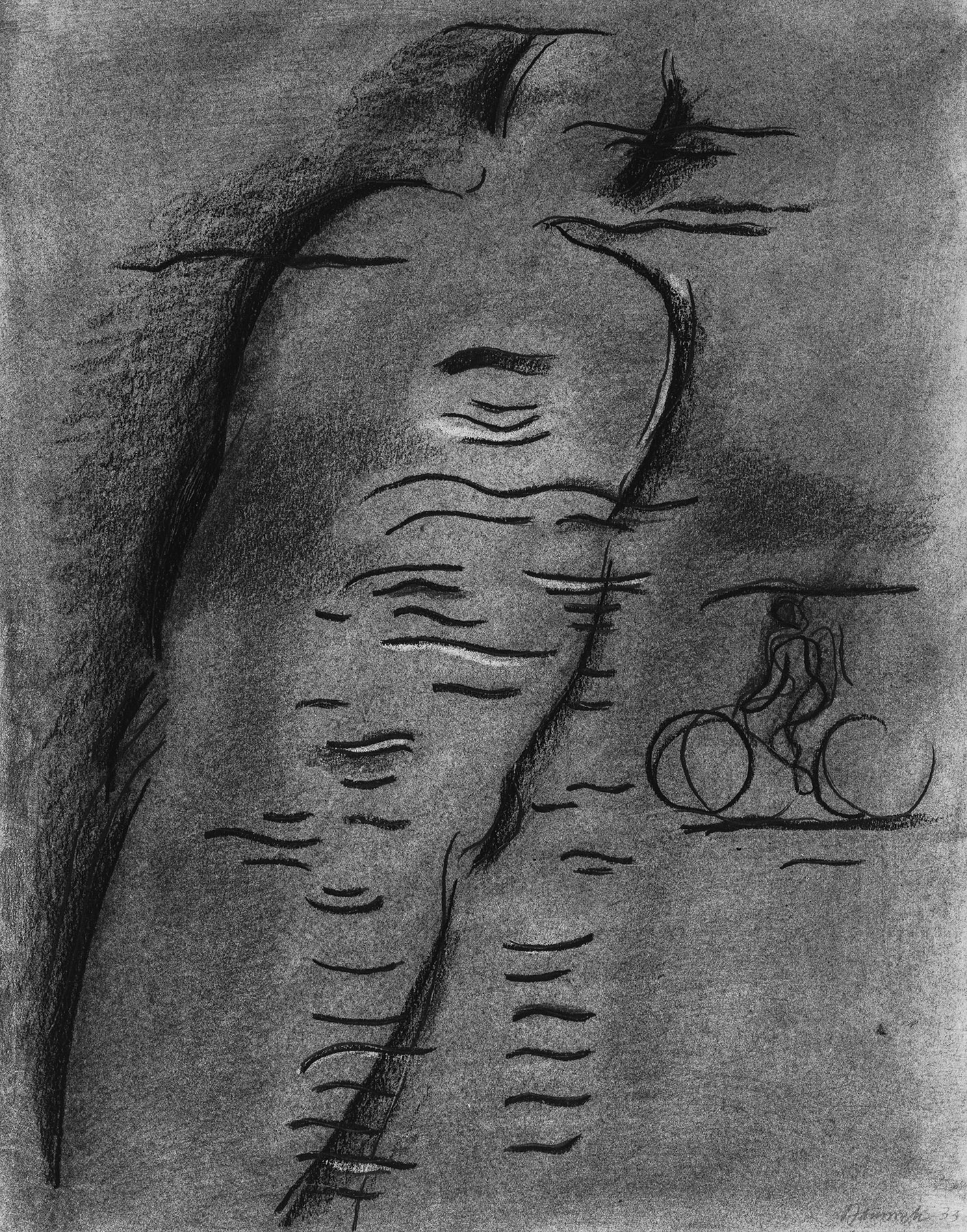 Kohle, gewischt, z. T. radiert, Bleistift, Ölkreide in Schwarz, Konturen mit hartem Bleistift vorgeritzt, fixiert, Einfassungslinien, auf chamoisfarbigem Zeichenkarton