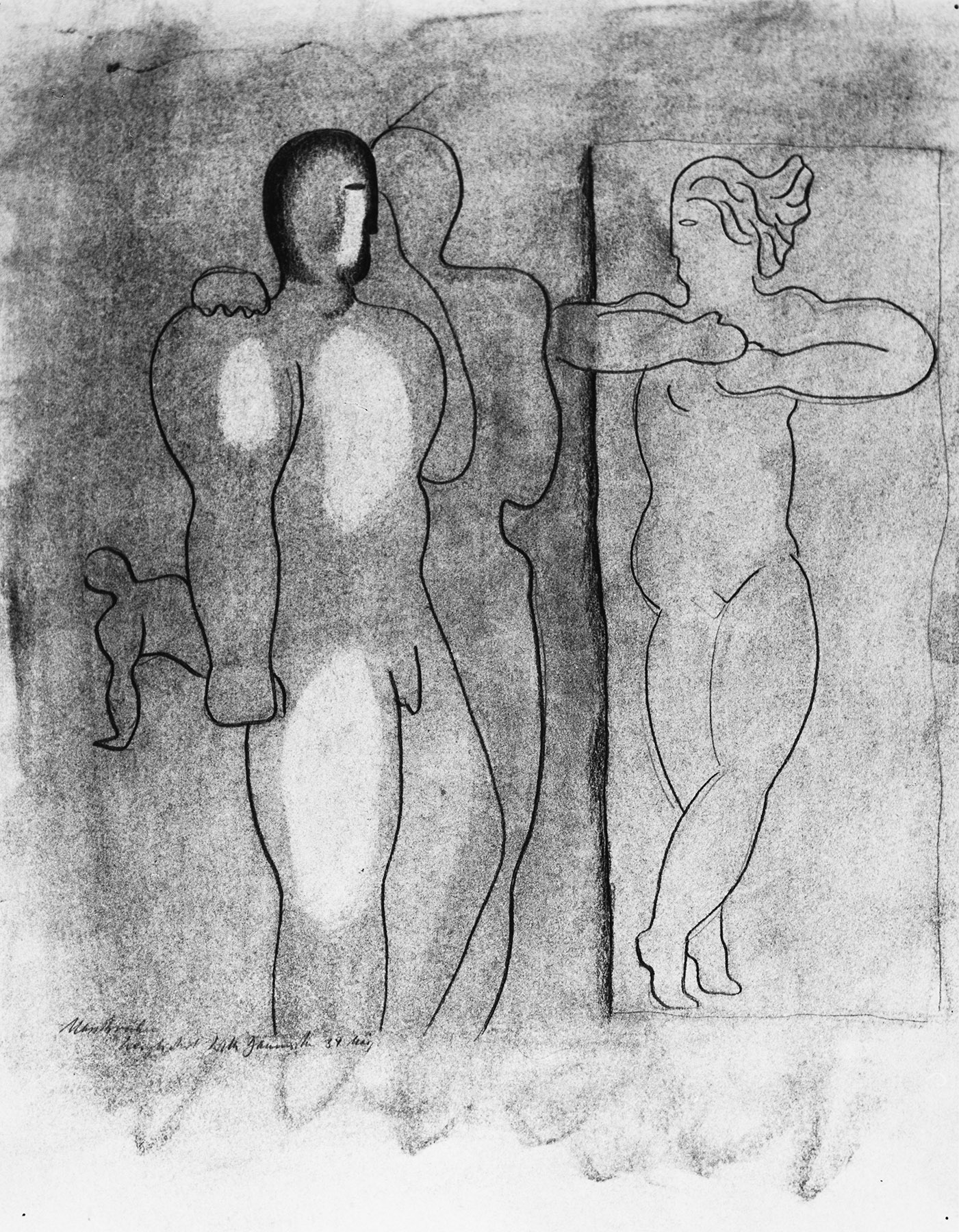 Kohle, gewischt, Bleistift, Ritzkonturen (mit Abweichungen), fixiert, auf chamoisfarbigem, am Rand l. perforiertem Zeichenkarton