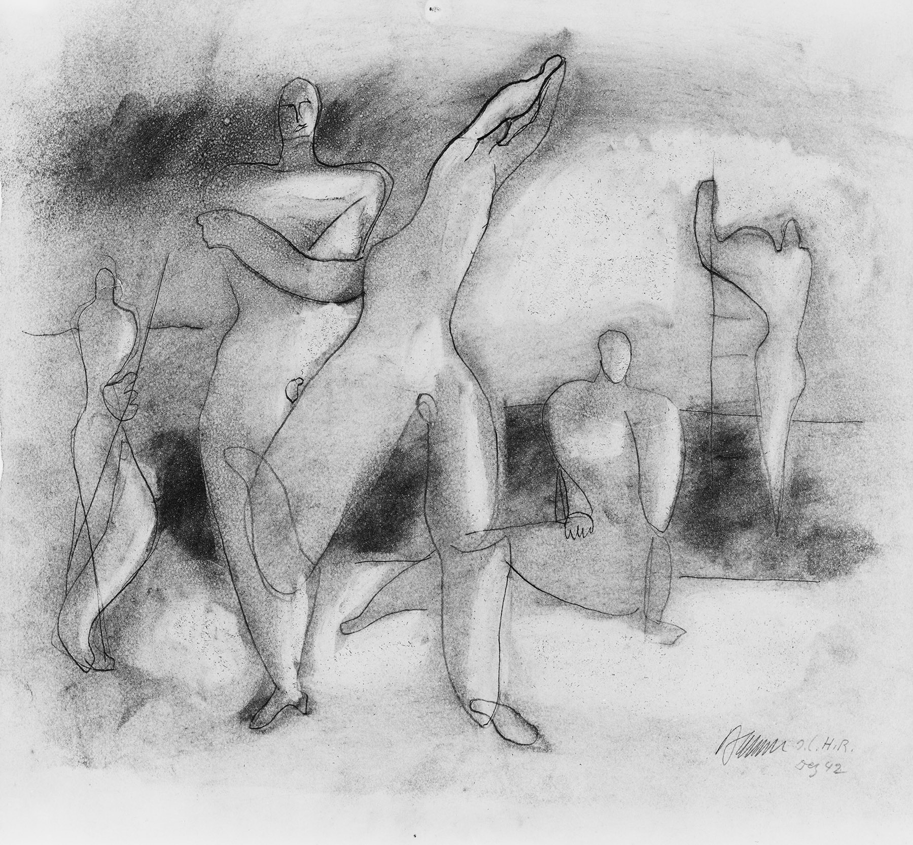 Kohle, gewischt und radiert, Bleistift, Ritzkonturen, fixiert, auf chamoisfarbigem Zeichenkarton