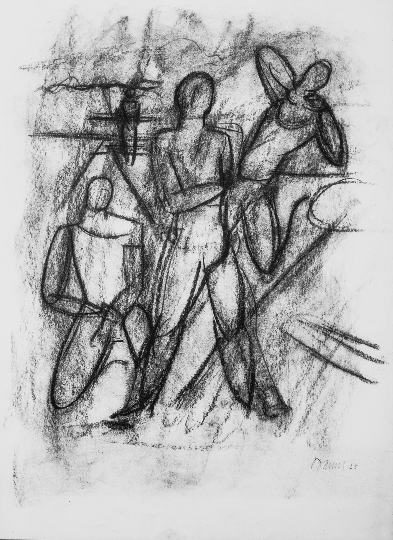 Kohle, z. T. gewischt, Bleistift, Ritzkonturen, fixiert, auf chamoisfarbigem, am Rand l. perforiertem Zeichenkarton