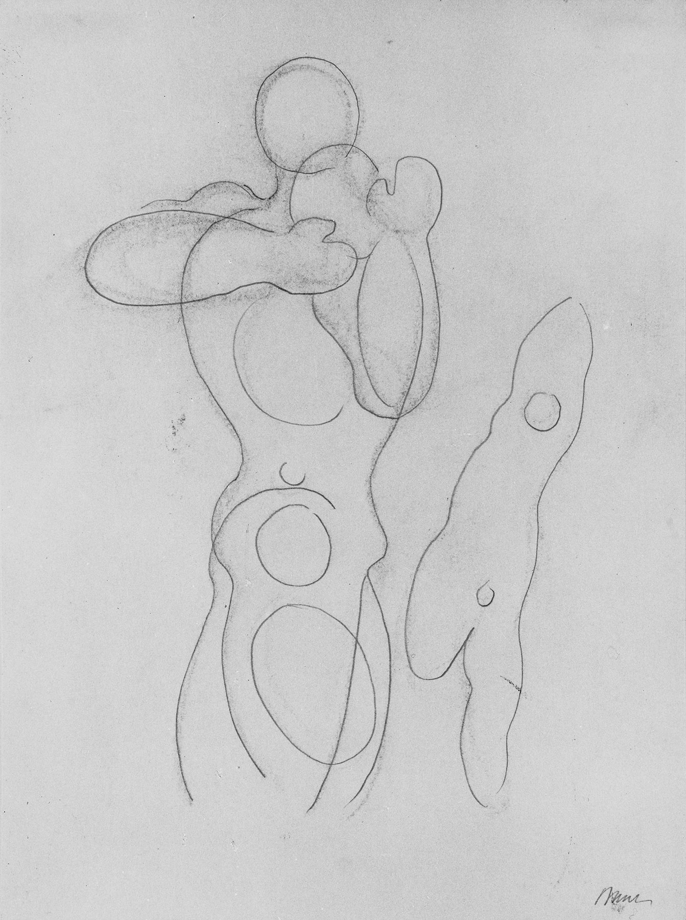 Bleistift über Kohlevorzeichnung, Konturen eingedrückt, auf chamoisfarbigem Zeichenkarton