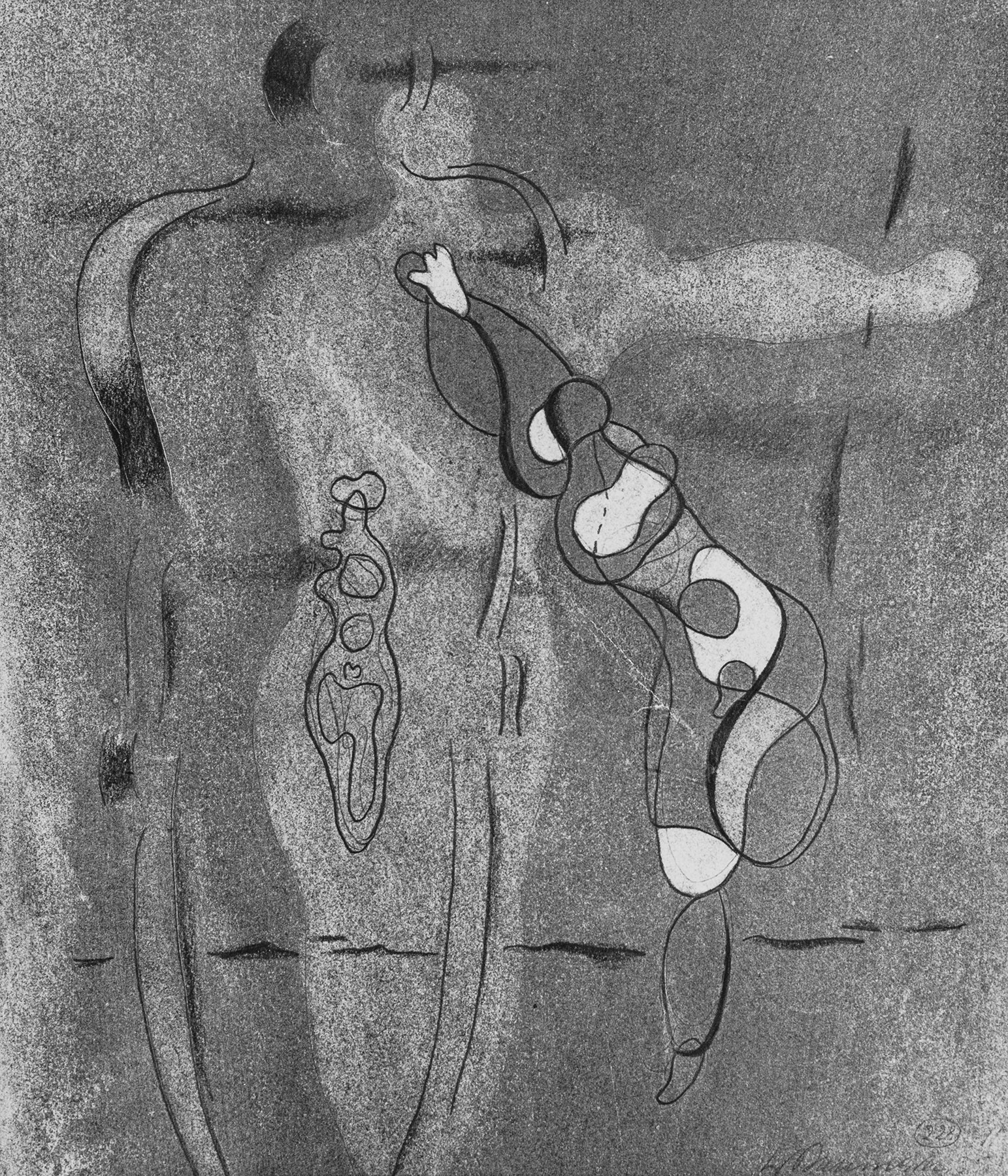Vgl. die kleine Linienfigur mit Z 396, 397 und auf dem von B. 1930 datierten Gemälde G 301. (fkb) 544-555: Eine Gruppe von Sportkompositionen zum Thema „Handball". Verschiedene Formelemente sind erkennbar. Im Motiv der Linienfigur werden Körperteile wie Bewegungen linear interpretiert und die einzelnen miteinander an Schnittpunkten verbundenen Kompartimente in Hell und Dunkel wechselnd vorgeführt. Der Spielpartner, der dialogisch dazugesetzt wird, ist als Schattenfigur konzipiert, die aus dem dunklen Grund ausgespart bzw. ausradiert wurde. B. gestaltet somit erneut ein Wechselspiel von Negativ- und Positivformen. 544: Eine der reichsten und vielfältigsten Kompositionen, die alle genannten Elemente beispielhaft vorführt: Im Hintergrund erkennt man klein die Linienfigur, deren Körper in einzelne Kompartimente aufgelöst ist, rechts in Bewegung die Linienfigur, bei der sich die Kompartimente überlagern und in Hell und Dunkel gegeneinander gesetzt werden, während die Umrisse zugleich an- und abschwellen; links außen befindet sich eine stehende Schattenfigur mit ausgestrecktem Arm wie beim „Speerwerfen" oder dem „Barrenspringen", als Schattenfigur sowie als Schemenfigur: eine Form, wie sie aus der Linienfigur der Jahre 1932ff. erwachsen ist.