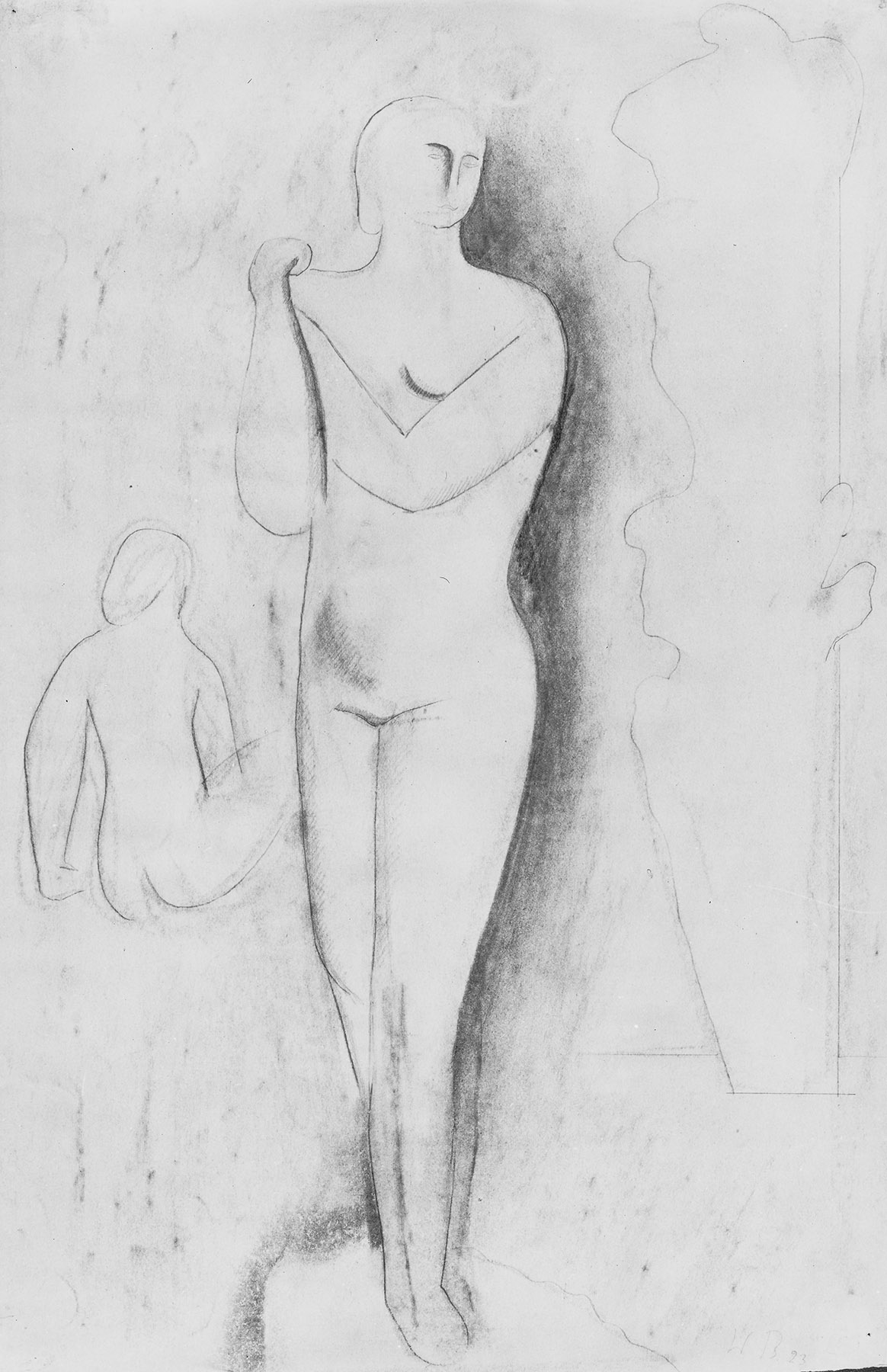 Kohle, Bleistift, auf gelblichem Papier, durch Fixativ vergilbt