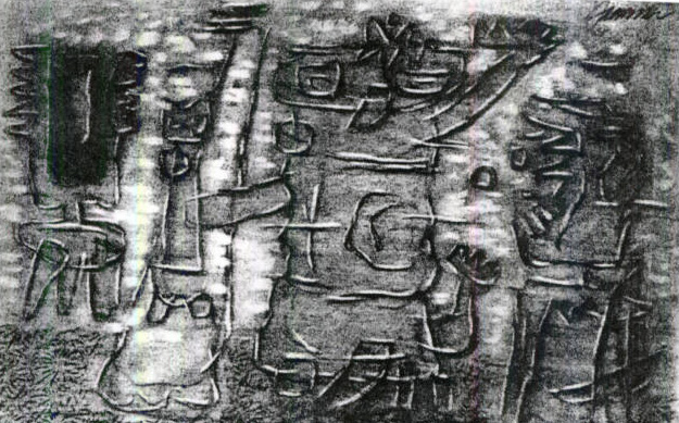 schwarze Kreide, Weiß-Aussparungen und Glasdruchreibungen auf chamoisfarbigem Bütten