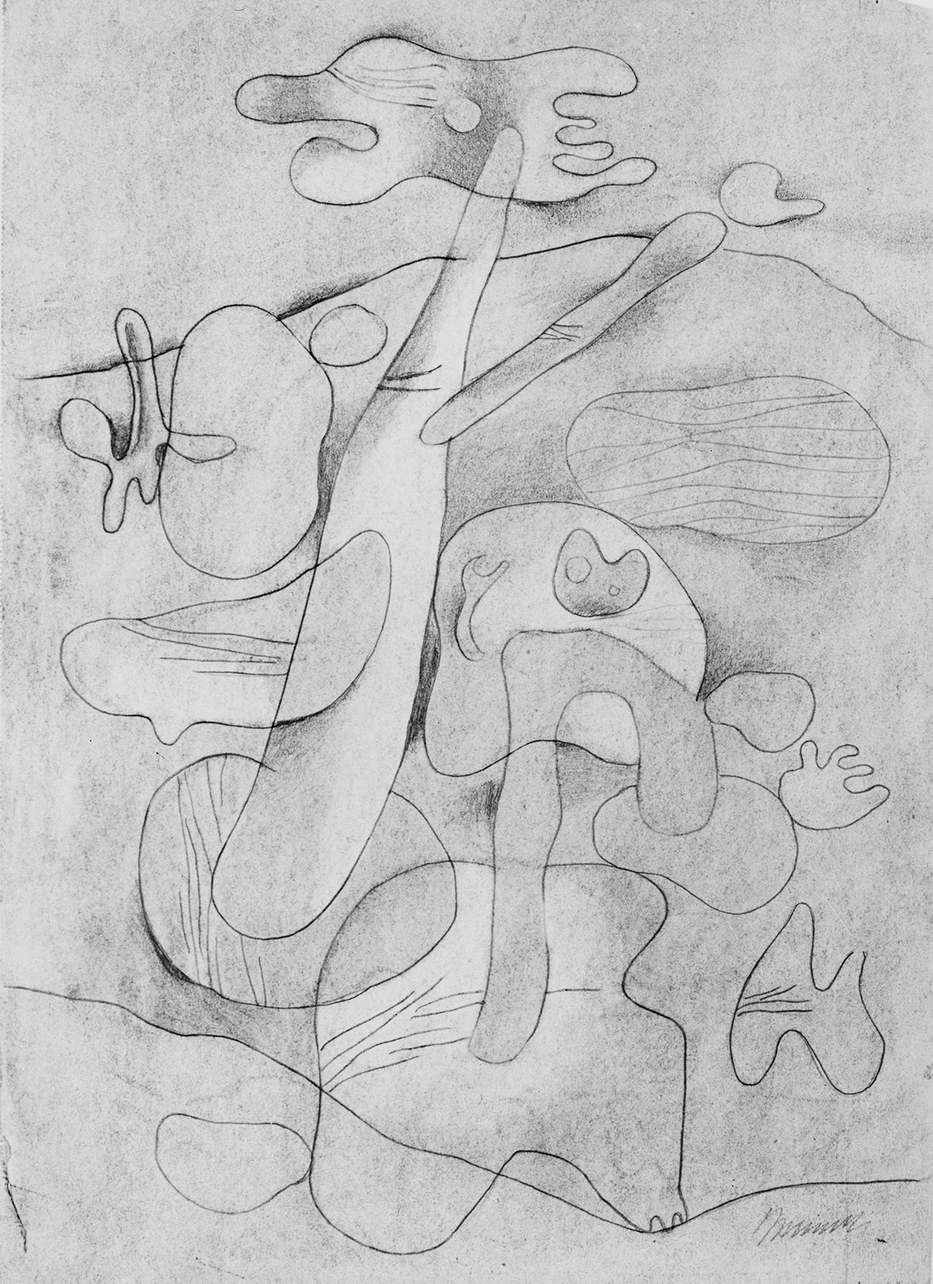 Kohle, gewischt, Bleistift, Konturen z. T. mit hartem Bleistift vorgeritzt, wiederholend übergangen (mit Abweichungen), Skizzierung in Kohle (mit großen Abweichungen), fixiert, auf chamoisfarbigem, am Rand l. perforiertem Zeichenkarton