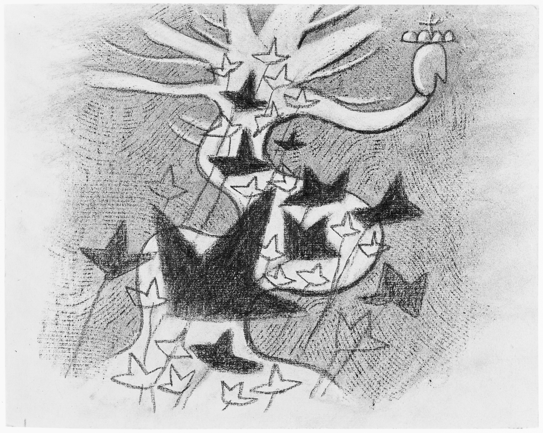 Kohle, gewischt, radiert, Ölkreide in Schwarz, z. T. durchgerieben, fixiert, auf lindgrünem Ingres-Bütten