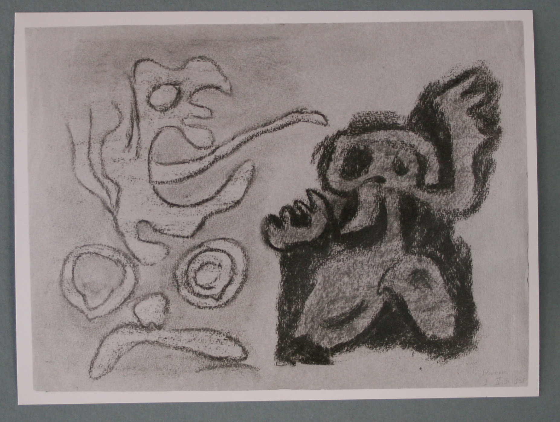 Kohle, z. T. gewischt, fixiert, auf ziegelrotem Ingres-Bütten