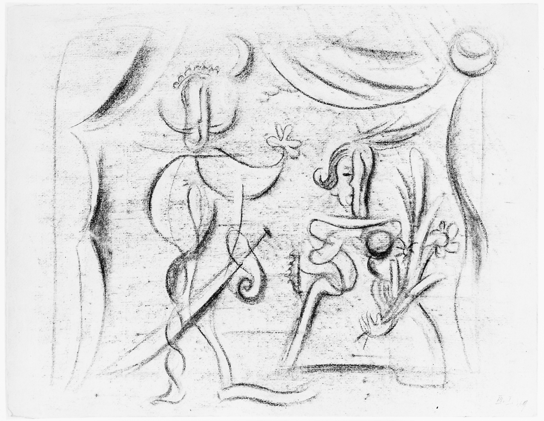 Kohle, z. T. gewischt, Ölkreide in Schwarz, fixiert, auf chamoisfarbigem Ingres-Bütten