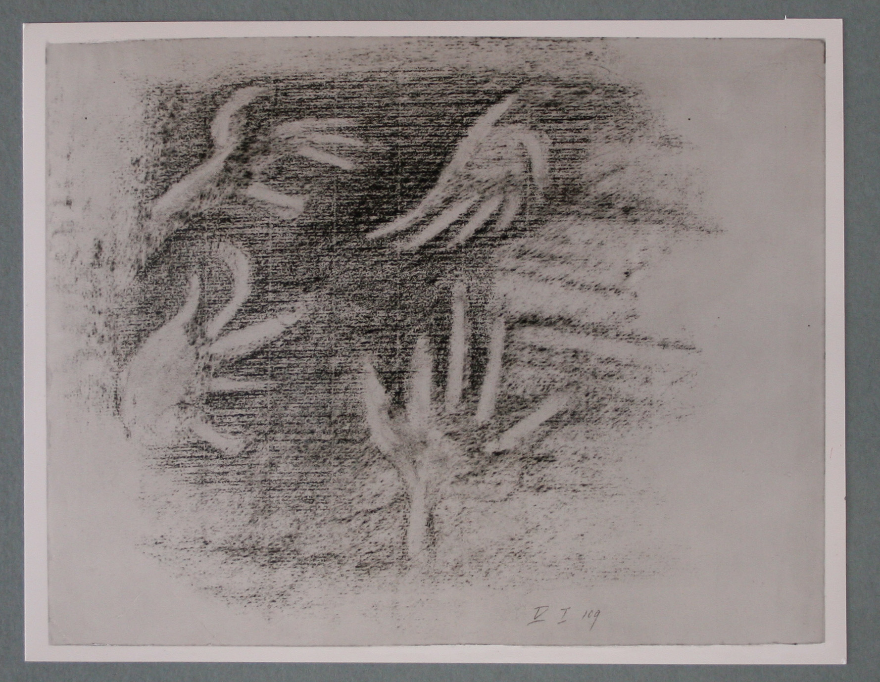 Kohle, gewischt, radiert, Ölkreide in Schwarz, durchgerieben, fixiert, auf chamoisfarbigem Ingres-Bütten