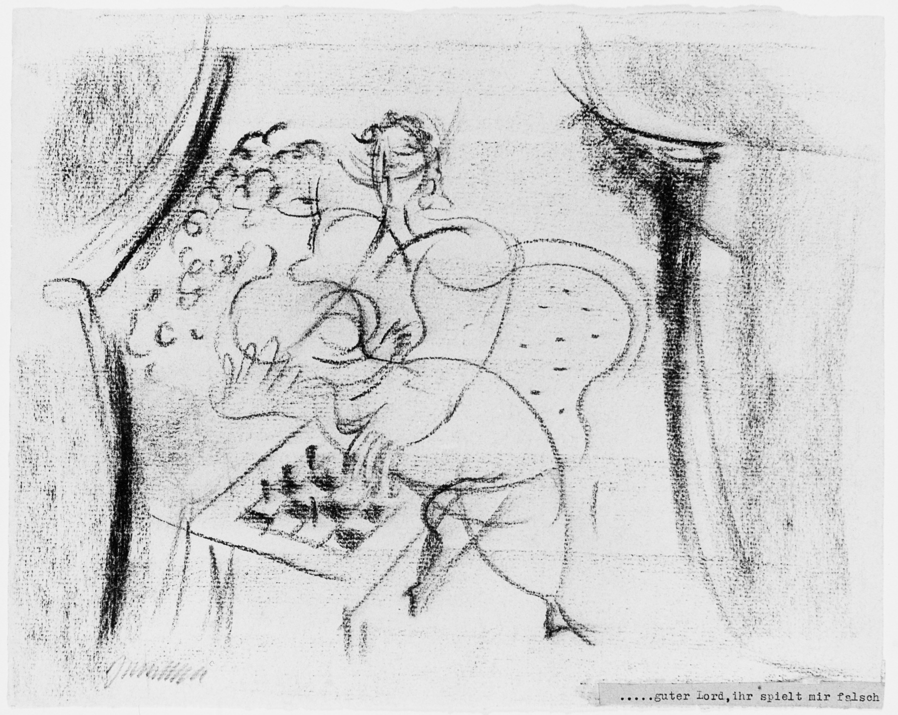 Kohle, gewischt, fixiert, auf lichtblauem, am Rand o. und u. leicht unregelmäßig gerissenem Ingres-Bütten mit Wz. l. u.: INGRES