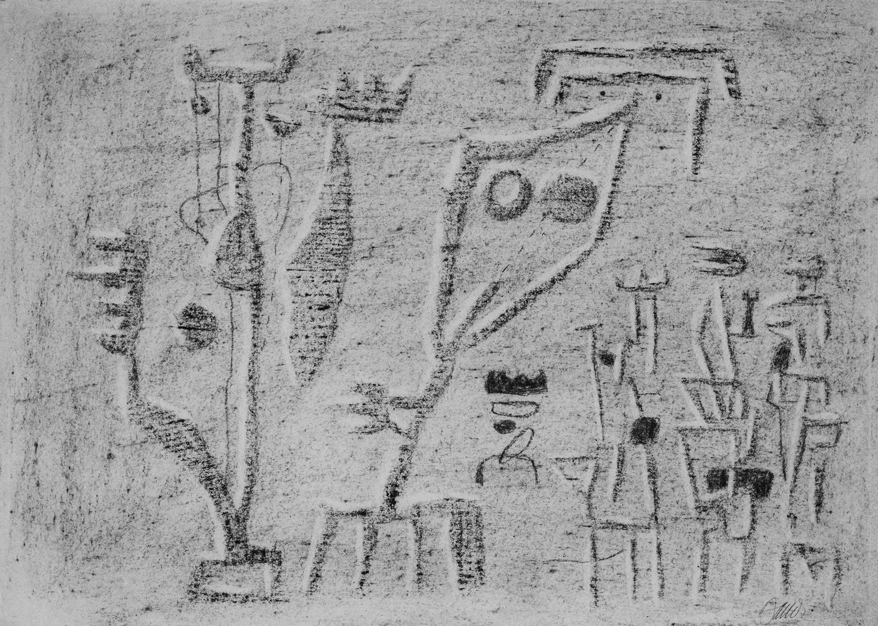 Kohle, gewischt, radiert, Ölkreide in Schwarz, fixiert, auf gelblichem Bütten (Vorsatzpapier)
