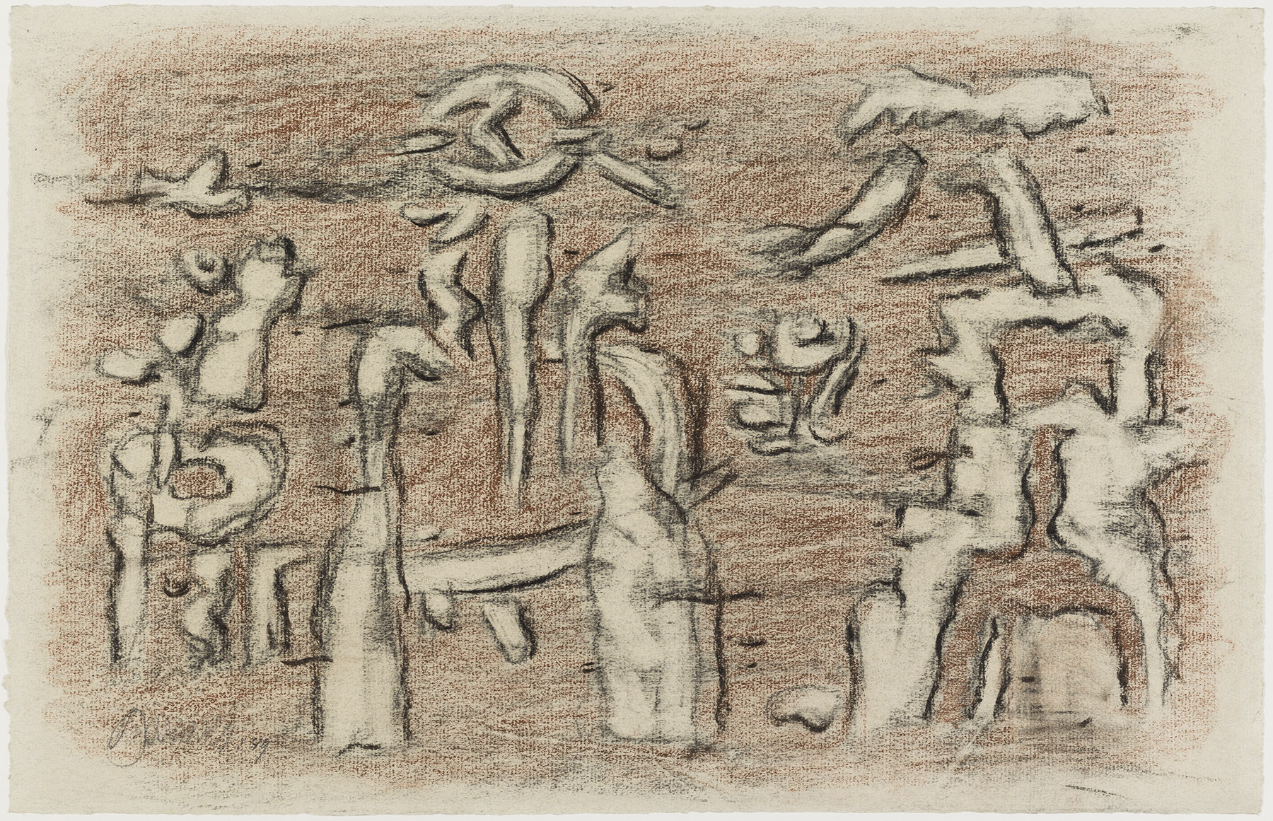 Kohle, leicht gewischt, Ölkreide in Braun, fixiert, auf chamoisfarbigem Ingres-Bütten mit Wz. r. o.: MONTGOLFIER FRANCE und l. u.: Kartusche