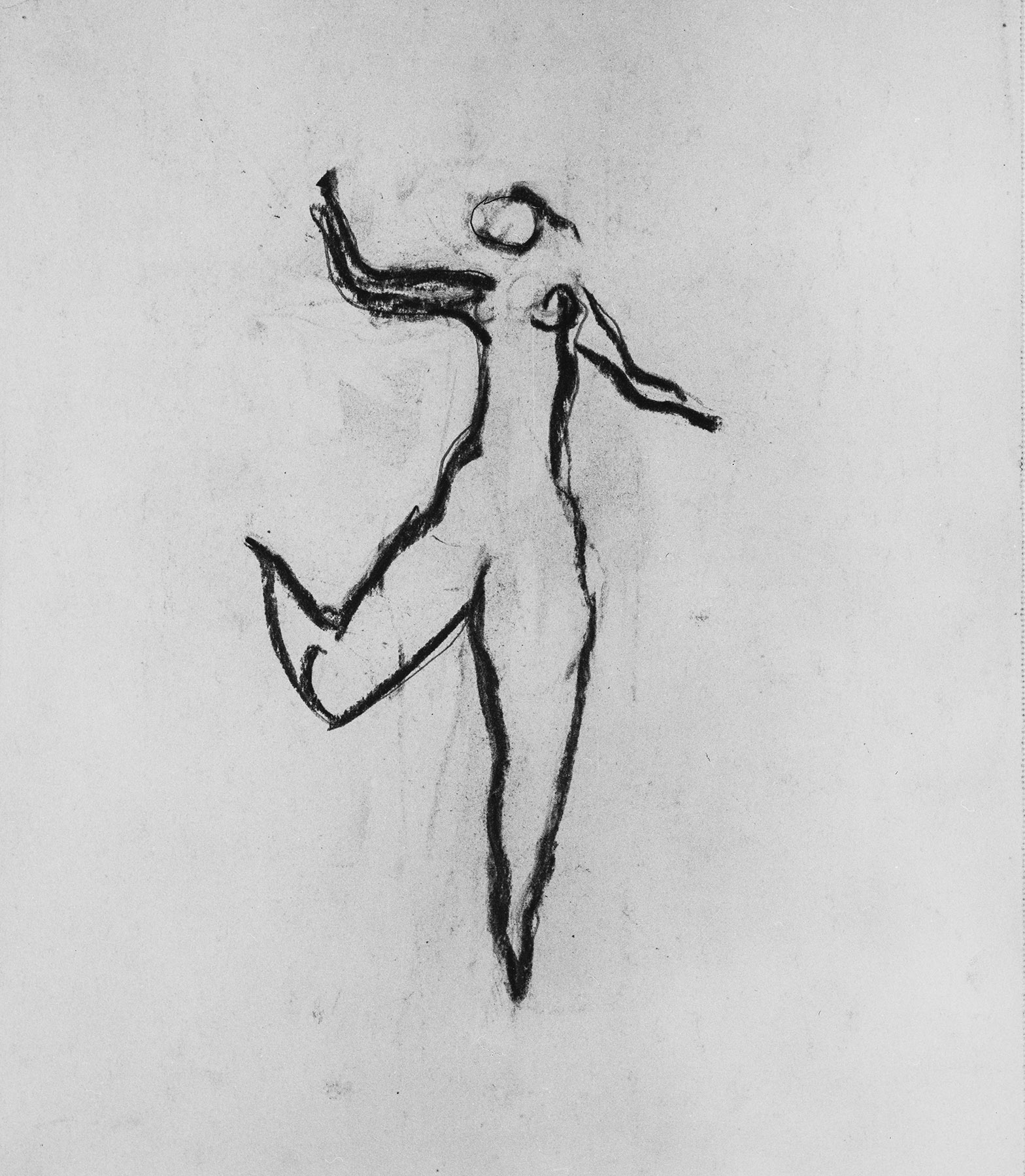 Kohle, Bleistift, Vorzeichnung in Kohle, Pentimenti, unfixiert, auf chamoisfarbigem, am Rand r. perforiertem Zeichenkarton