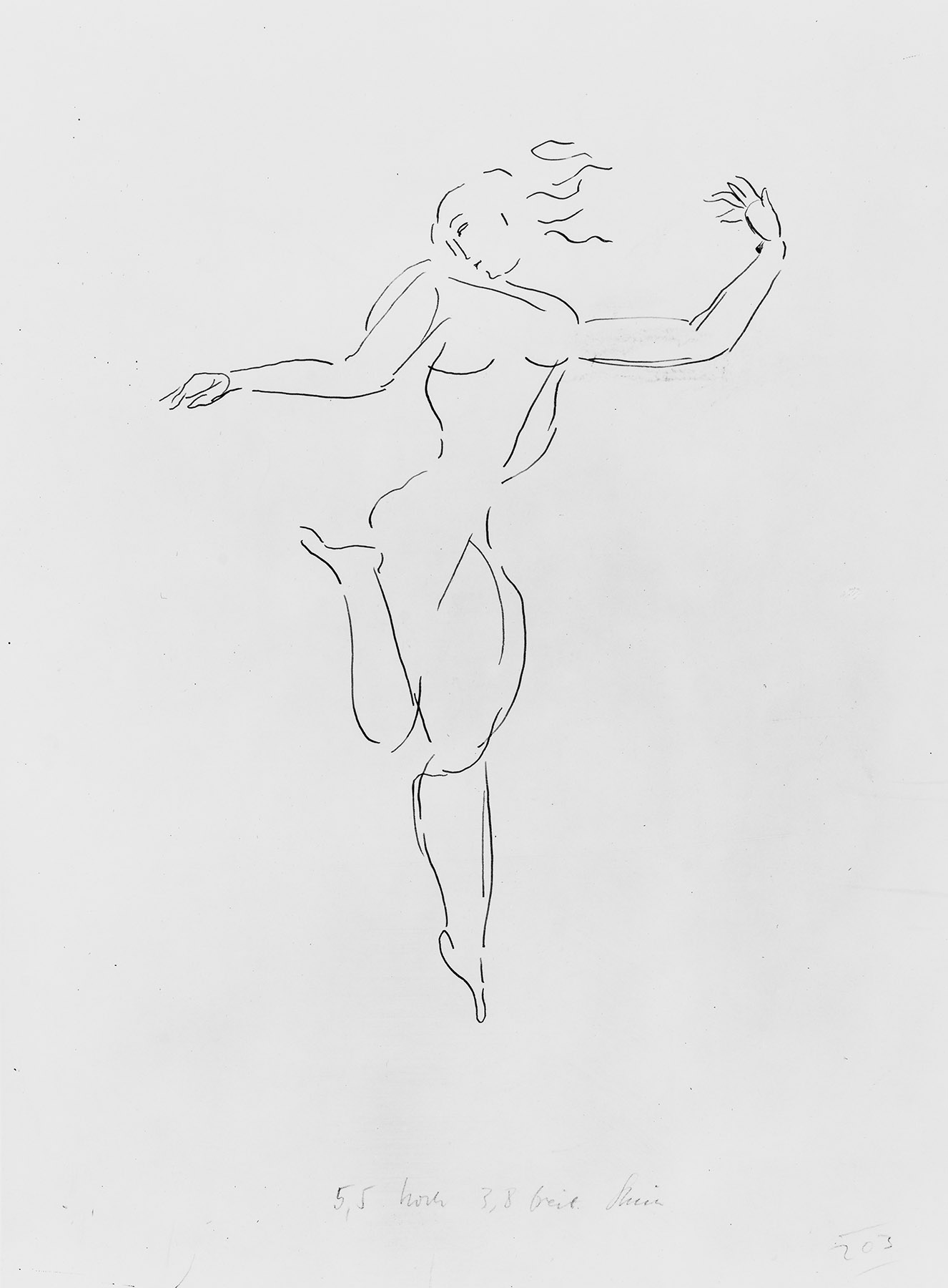 Feder in dunkelblauer Tinte auf chamolsfarbigem, dünnem Zeichenkarton (Haltung des linken Armes korrigiert, Rasuren)