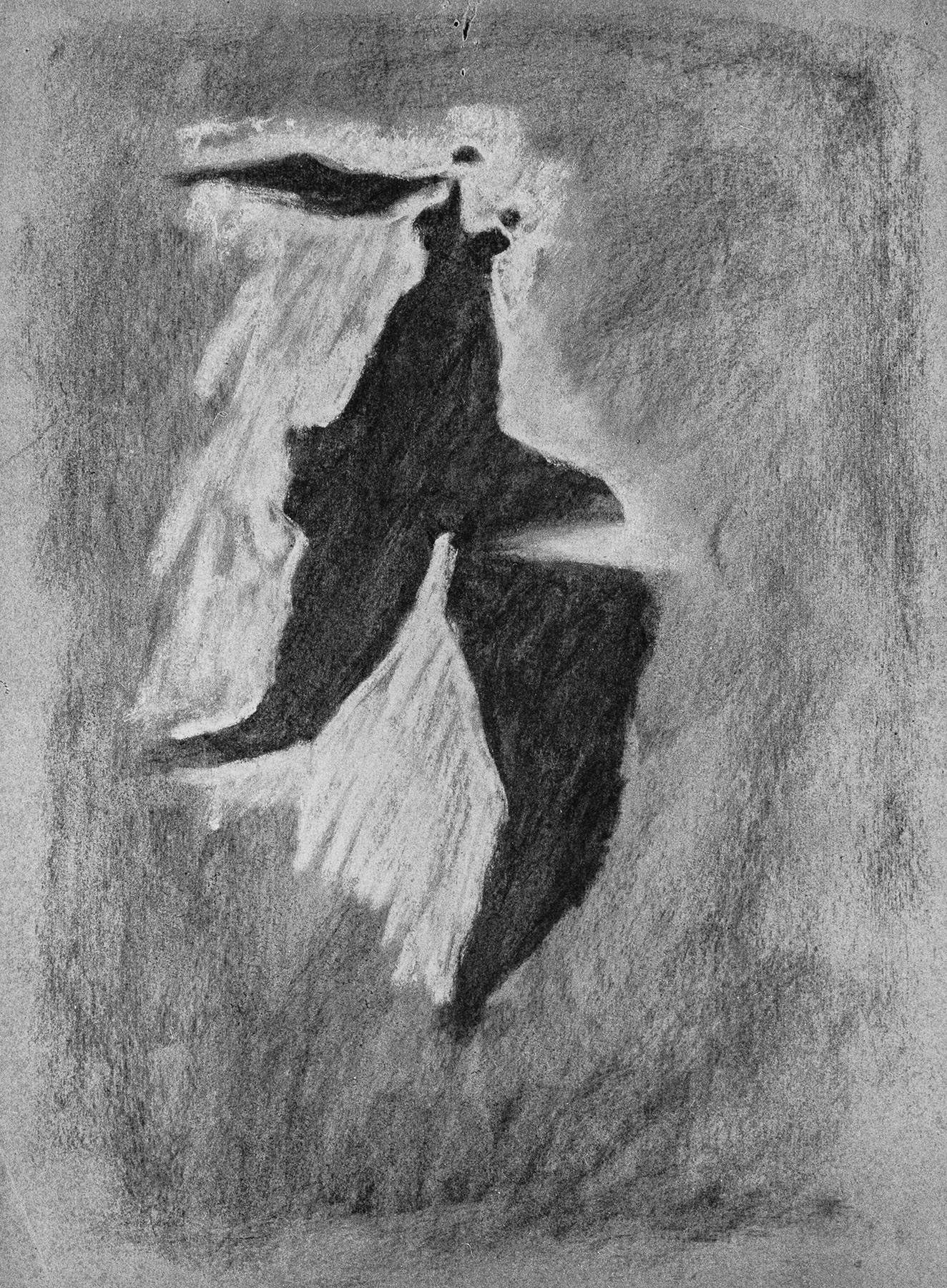 Kohle, gewischt, Pastell in Maisgelb, fixiert, auf oliv-farbigem, am Rand o. perforiertem Maschinen-Bütten