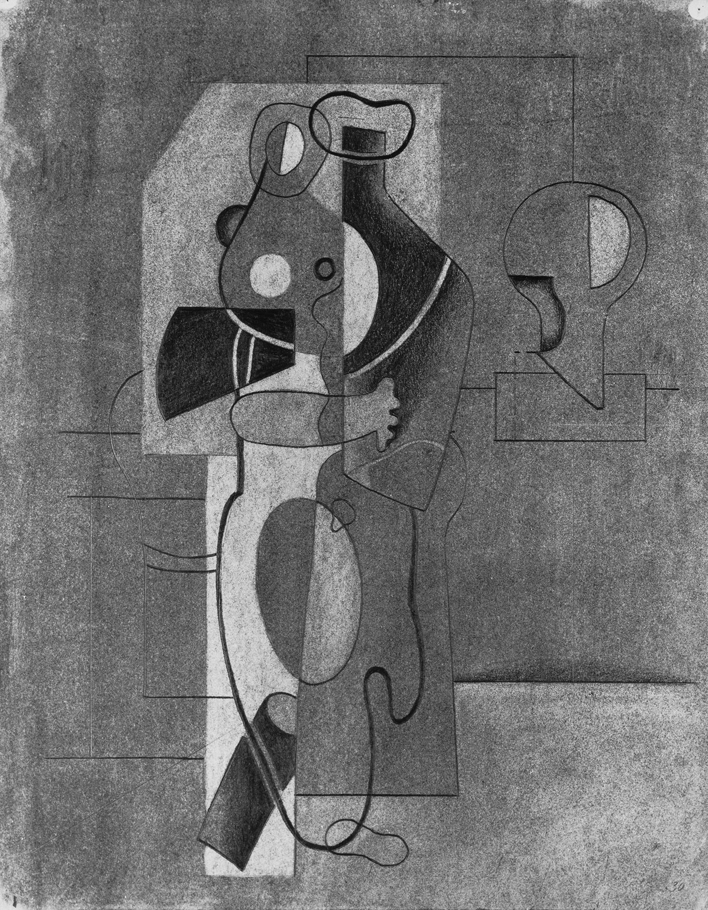 Kohle, gewischt, Bleistift, Konturen vorgeritzt, unter Verwendung des Lineals, fixiert, auf chamoisfarbigem, am Rand l. perforiertem Zeichenkarton