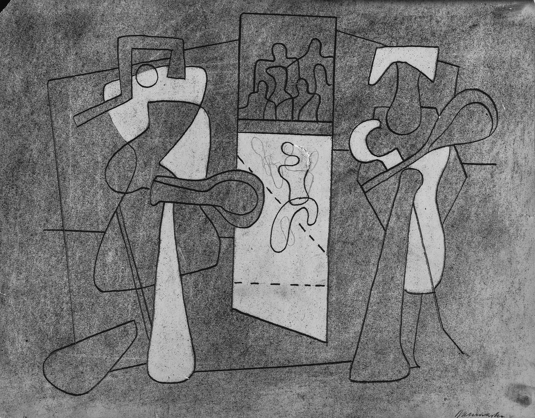 Verschollen, Foto im Archiv Baumeister. Vorlage für die Lithographie Sp 94. Von B. auf einem Archivfoto bezeichnet: „Willi Baumeister / dessin / 1931 / (tennis)“; auf zweitem Archivfoto im hellem Mittelfeld mit Bleistift überzeichnet. Vgl. das verschollene Gemälde, nicht bei G, das auf einem Foto der Atelierwand in der Frankfurter Kunstschule um 1932 zu erkennen ist. (fkb)