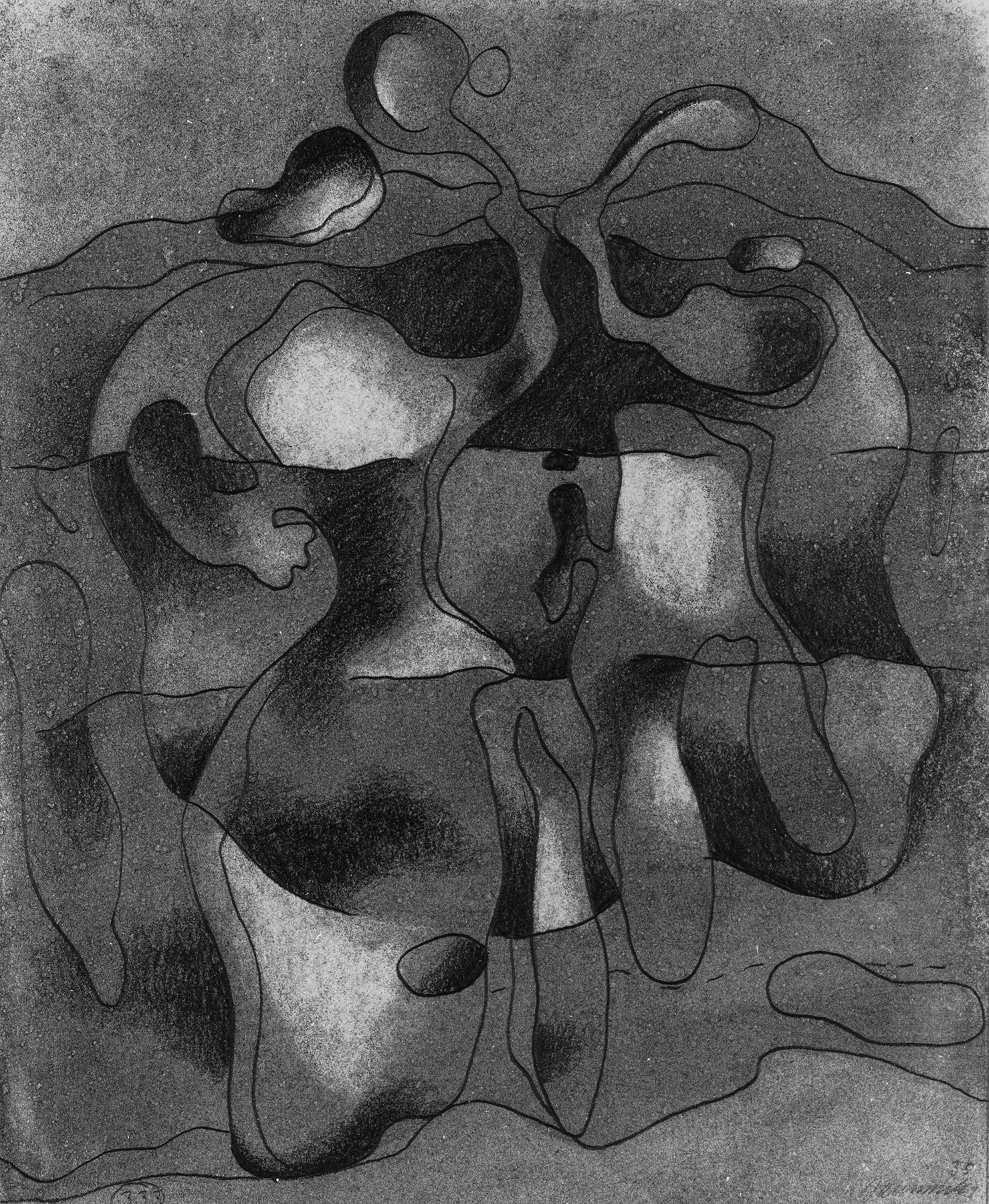 Ein besonders überzeugendes Beispiel. Die Komposition wird bestimmt durch das beibehaltene Motiv der Linienfigur, jedoch werden die einzelnen Kompartimente grau und hellgrau modelliert. Die Gliederung in verschiedene Zonen suggeriert eine landschaftliche Situation. Vgl. die beiden von B. 1935 datierten Gemälde G 338 und 339. (fkb) Vgl. Z 563. (fkb)