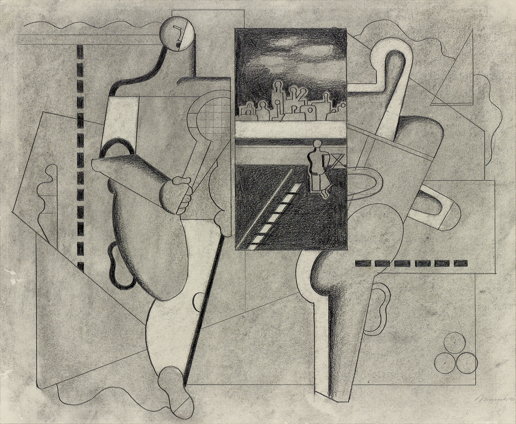 Diese Komposition ist 1929 datiert und zeigt am stärksten die konstruktivistischen Elemente. Wie in der Fotozeichnung von 1927, „Tennis“, Z 207, erscheint hier ein Element - der Ausschnitt aus den Zuschauerreihen - wie eine Collage eingefügt; hierzu dienen allein die Mittel der Zeichnung. Vgl. G 288, von B. 1929 datiert, und das verschollene, 1929 in der Galerie Flechtheim in Berlin ausgestellte Gemälde „Tennisspieler" , Foto im Archiv Baumeister. (fkb) 350-354: Eine Gruppe von Kompositionen zum Thema Sport aus dem Jahre 1929/31, die von der konstruktivistischen Phase zu einer linearen hinüberleitet, wobei das Motiv der Collage in die Technik der Zeichnung überführt wird und beständig erhalten bleibt.