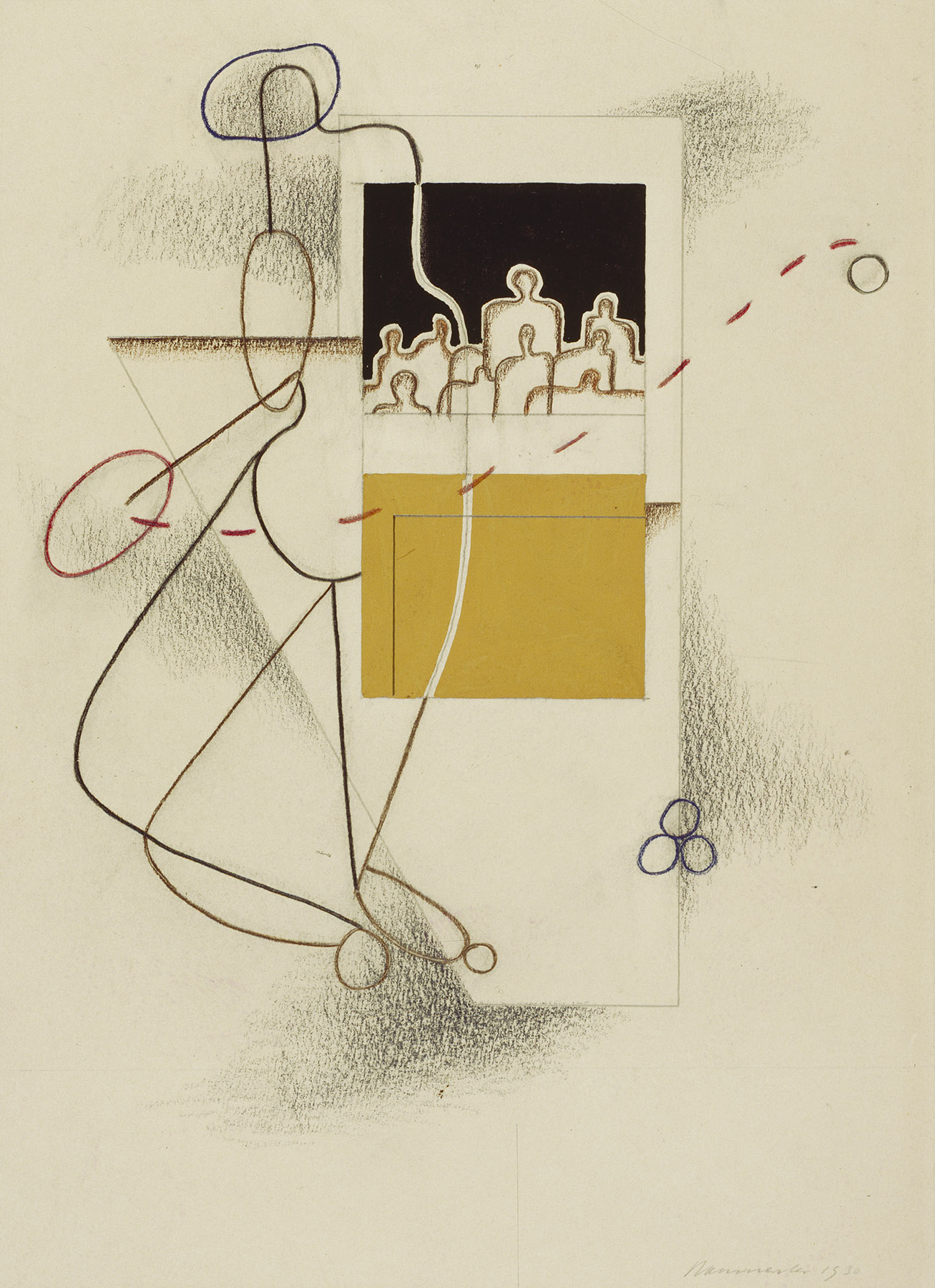 Deckfarbe in Ockergelb und Schwarz, Ölkreide in Rot, Blau, Braun, Orange, Bleistift z. T. leicht gewischt, sonst gerieben, unter Verwendung des Lineals, über sehr schwacher Skizze in Kohle (mit starken Abweichungen), Linien und Kurven z. T. mit hartem Ble