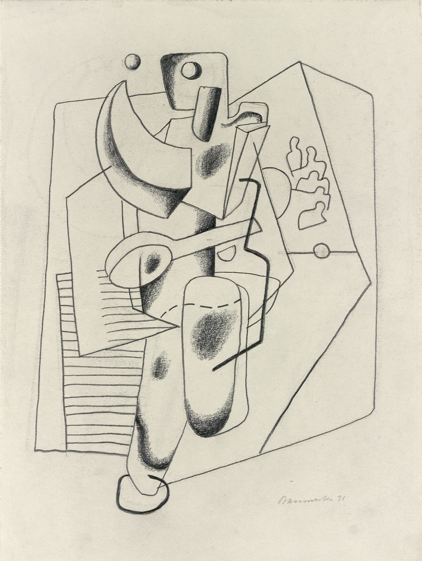 Bleistift, Kohle, gewischt, fixiert, Skizzierung in Kohle (mit starken Abweichungen), Konturen vorgeritzt, auf chamoisfarbigem, am Rand l. perforiertem Zeichenkarton