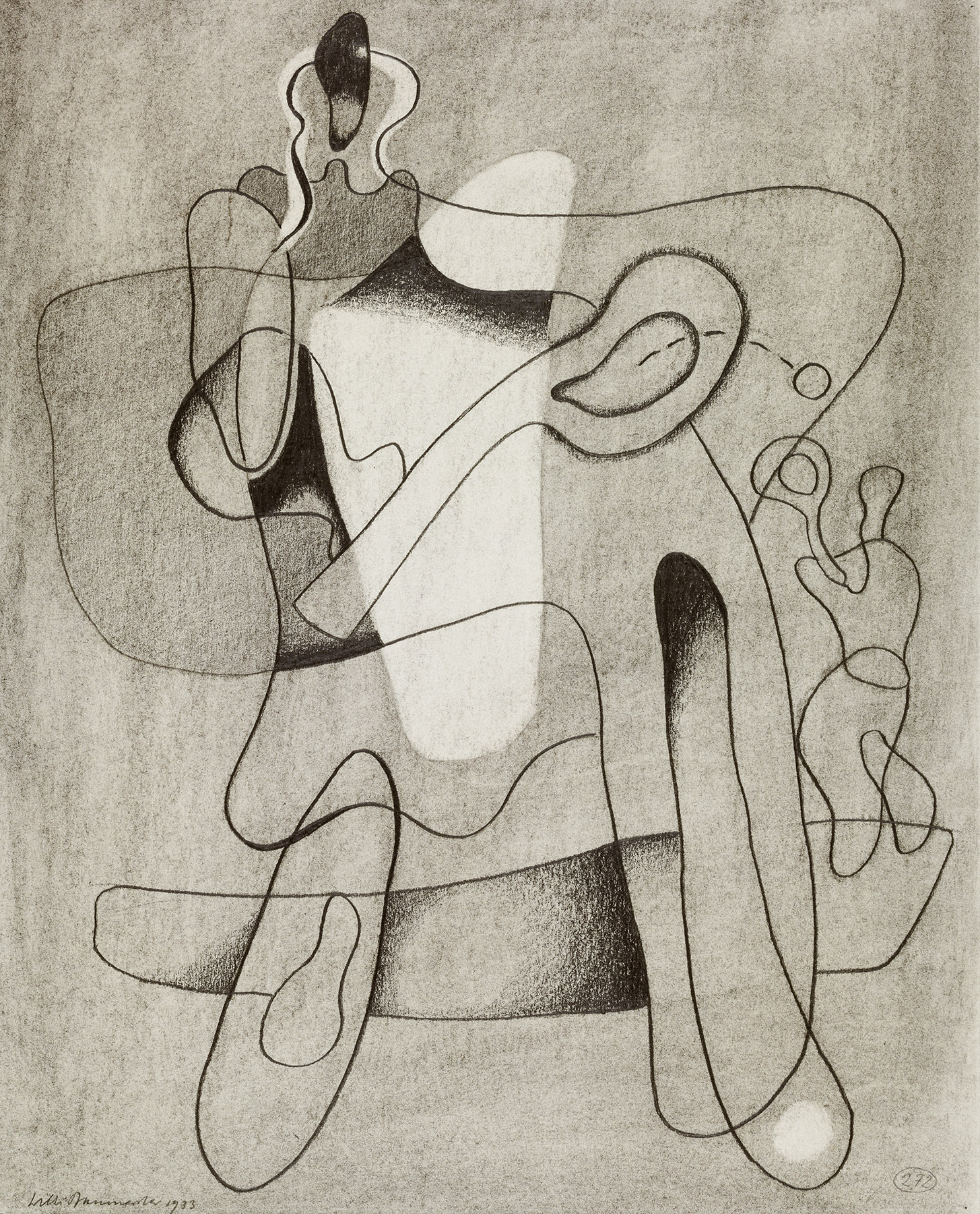 In der Darstellung stark abweichende helle Konturen = Spuren vom Durchdrücken oder Vorritzen des vorangehenden Blattes im Zeichenblock.