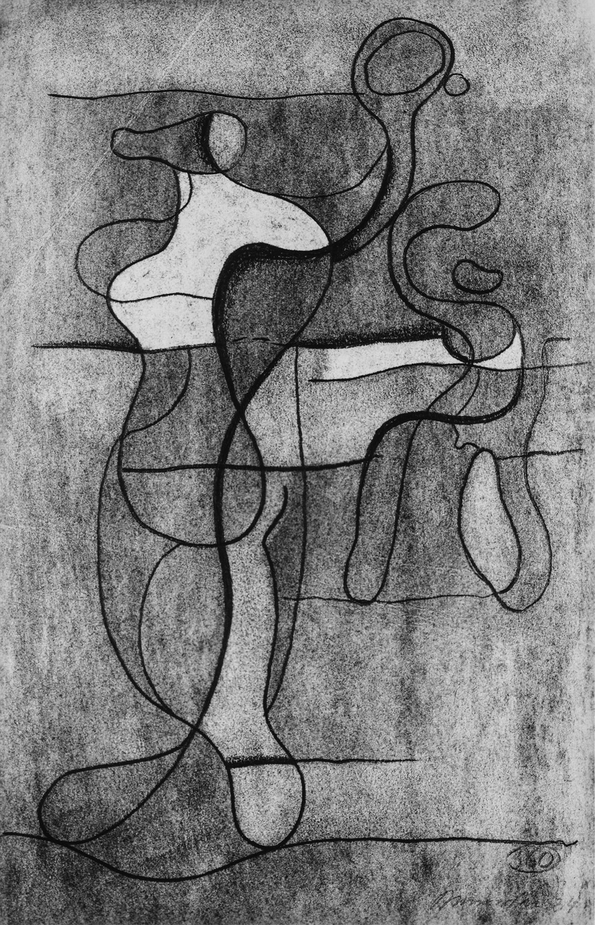 Bleistift, Kohle, gewischt, fixiert, Ritzkonturen, auf chamoisfarbigem Zeichenkarton