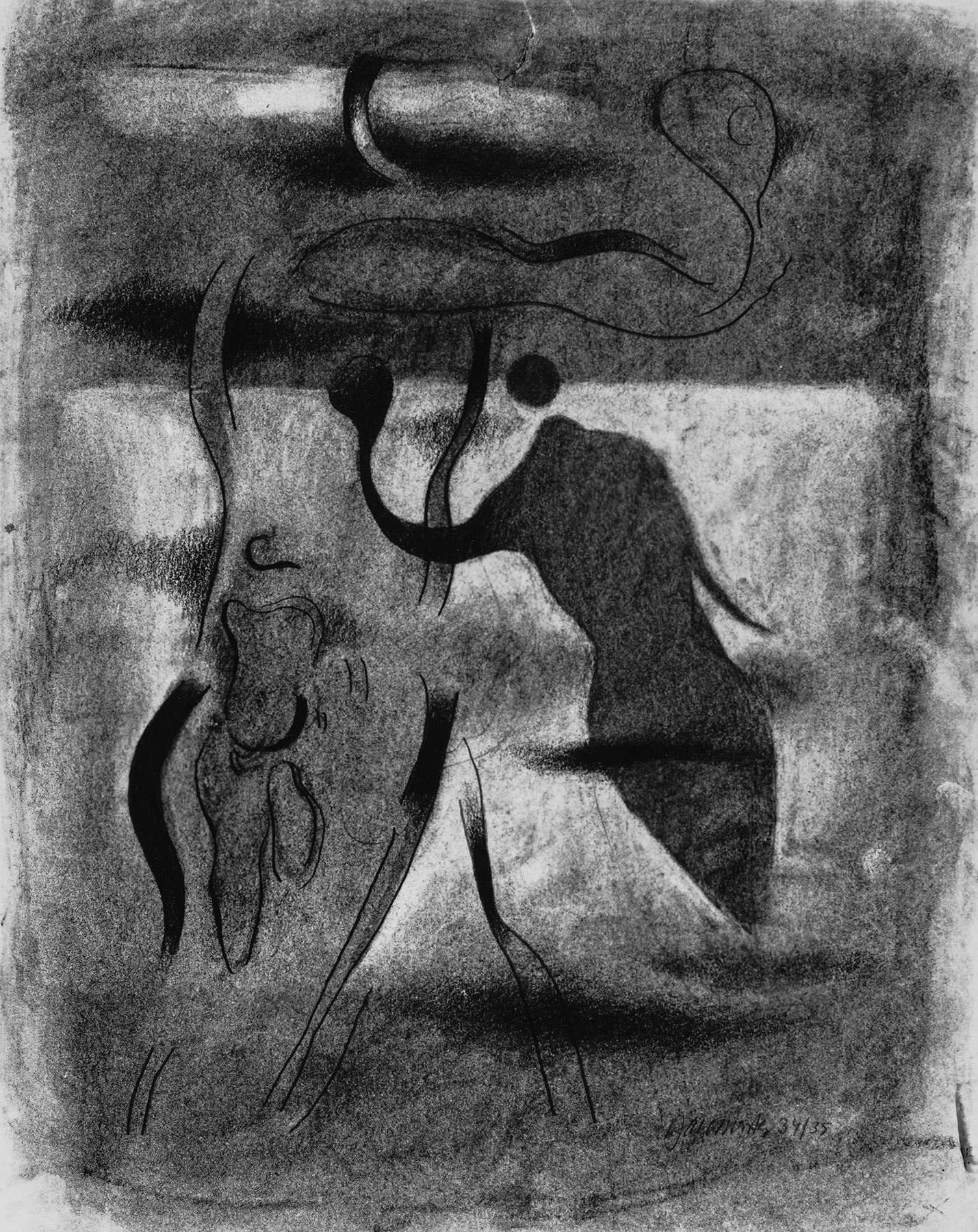 Kohle, gewischt, Bleistift, Konturen vorgeritzt (mit starken Abweichungen), fixiert, auf chamoisfarbigem, am Rand l. perforiertem Zeichenkarton