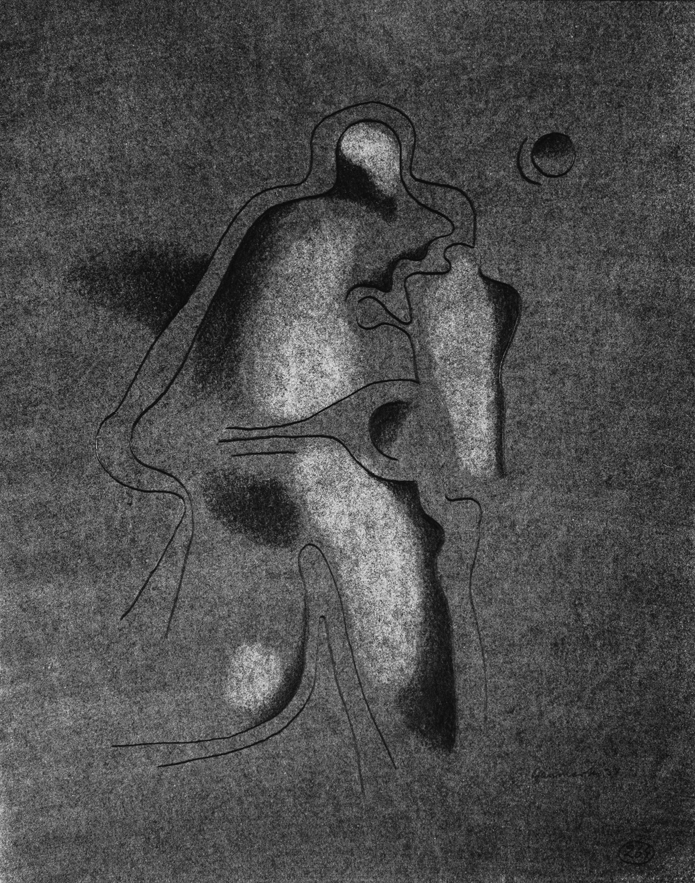 586-588: Die Datierung ist sehr unterschiedlich. Die Blätter gehören in den Zusammenhang der landschaftlich interpretierten Tennisspielers die aus der Schemenfigur entwickelt worden sind; jedoch werden bei den Blättern 587 und 588 die Figurenteile wieder stärker zusammengezogen, so daß sie wie amorphe Einzelformen im Raum schweben.