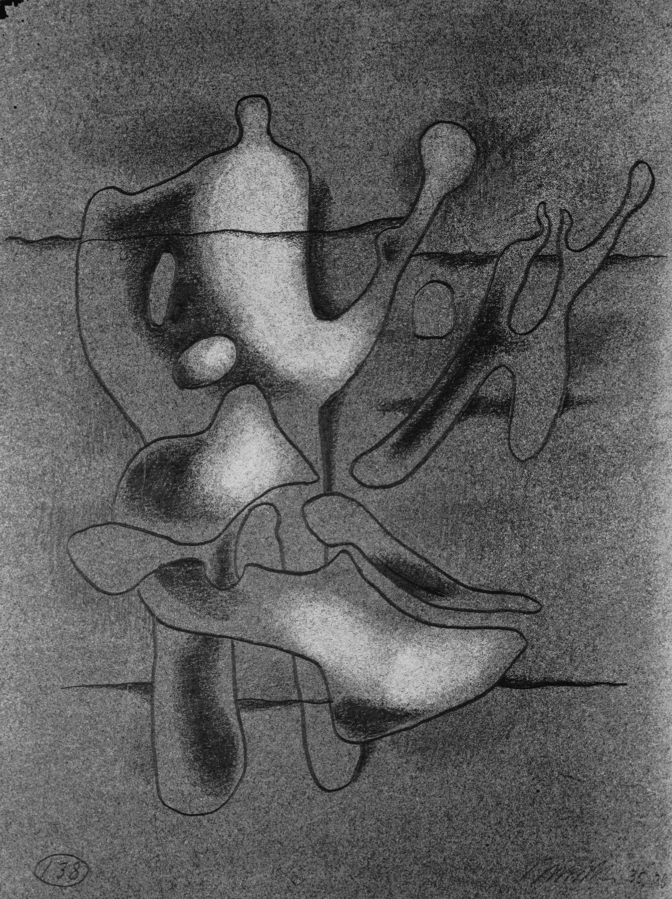 Kohle, gewischt, Bleistift, Konturen mit hartem Bleistift vorgeritzt (mit Abweichungen), fixiert, auf chamoisfarbigem Zeichenkarton, Rand r. durch Abtrennen im scharfen Knick entstanden