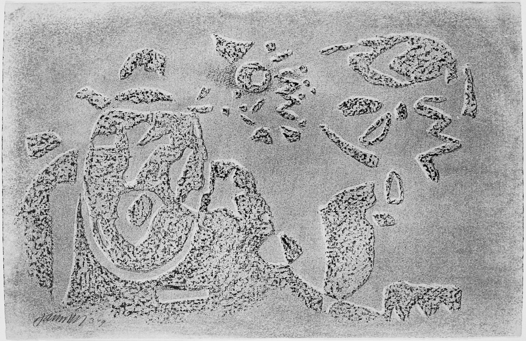 Kohle, gewischt, radiert, Ölkreide in Schwarz, durchgerieben, fixiert, auf hellem, graugrünem Ingres-Bütten mit Wz. r. o.: INGRES