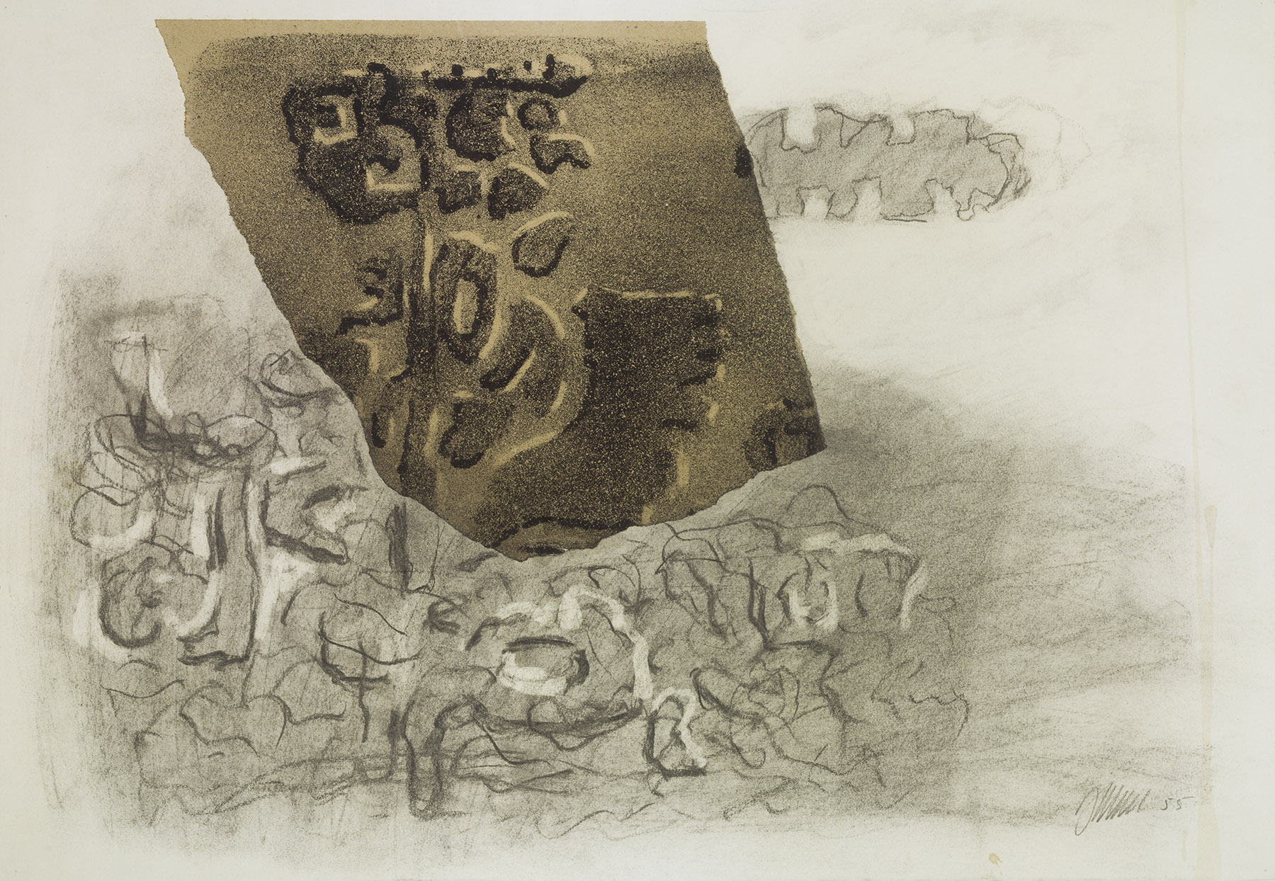 Kohle, gewischt, radiert, fixiert, Collage mit l. o. Teil einer Lithographie (Sp 170), die Ränder bis auf den oberen gerissen (Probedruck auf braunem, einseitig geglättetem Packpapier), auf chamoisfarbigem Aquarellkarton