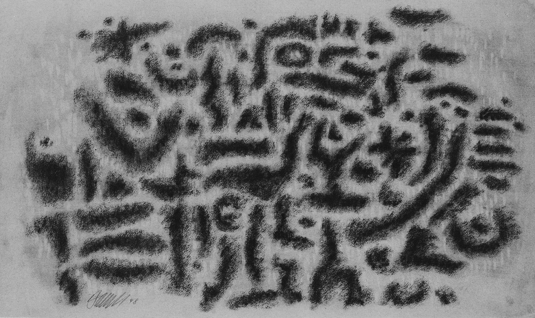 Die Ecken stark verknickt, Rand l. und r. verknickt, Rand r. leicht verschmutzt, Fixativ durchgedrückt.