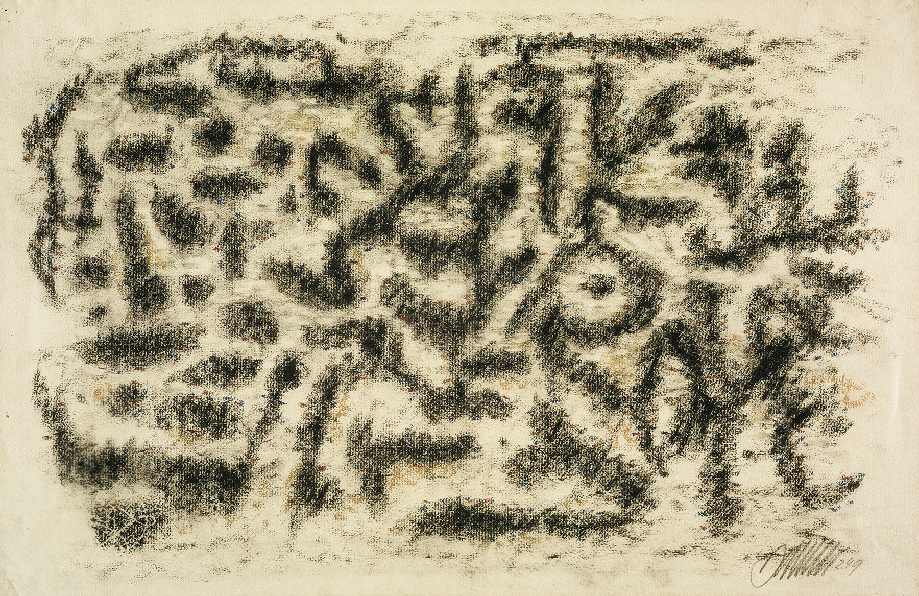 Kohle, gewischt, radiert, Pastell in Rot, Gelb, Blau, Braun, fixiert, auf maisgelbem Ingres-Bütten mit Wz. r. o.:.. NTGOLFIER FRANCE (beschnitten) und l. u.: Kartusche