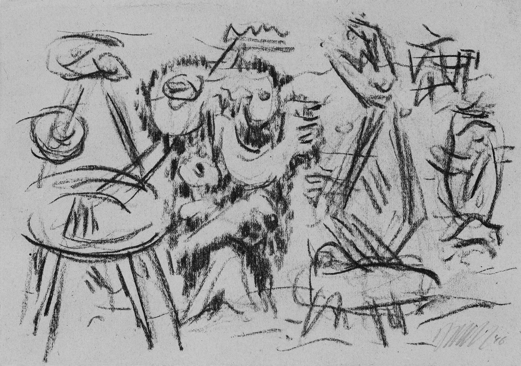 Kohle, fixiert, auf grünlich-beigefarbigem, holzhaltigem, dünnem, an den Rändern leicht unregelmäßig gerissenem Zeichenkarton