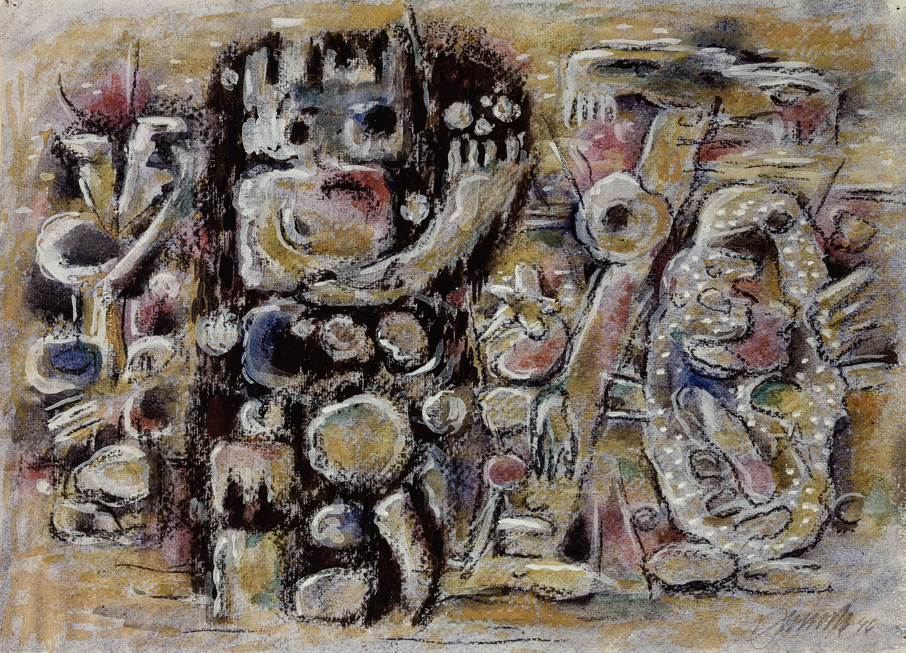 Kohle, Aquarell, Deckweiß, auf blau getöntem, weißem, genarbtem Bütten