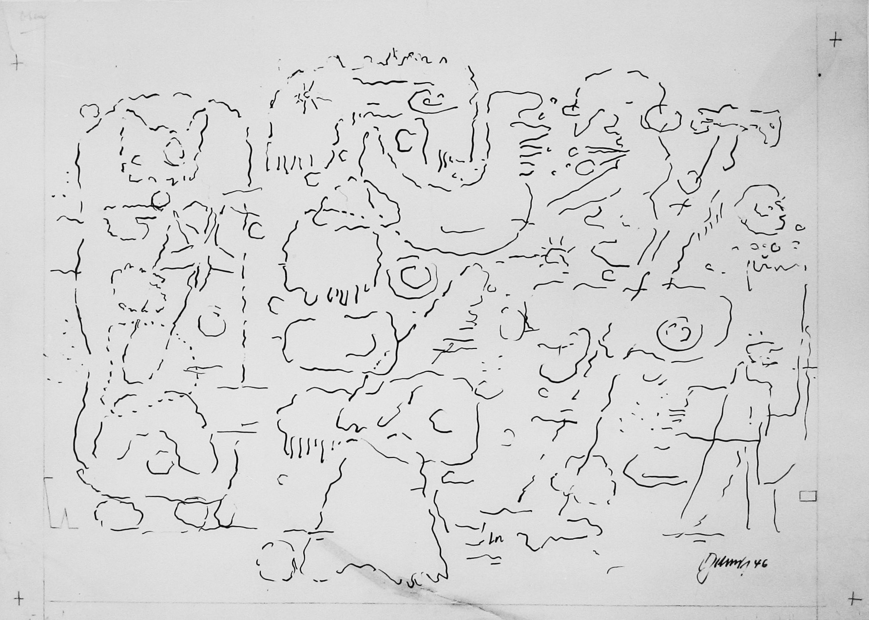 Feder in Schwarz, Bleistift, Einfassungslinien und Kreuze in Bleistift an allen 4 Ecken, auf am Rand o. perforiertem Transparentpapier