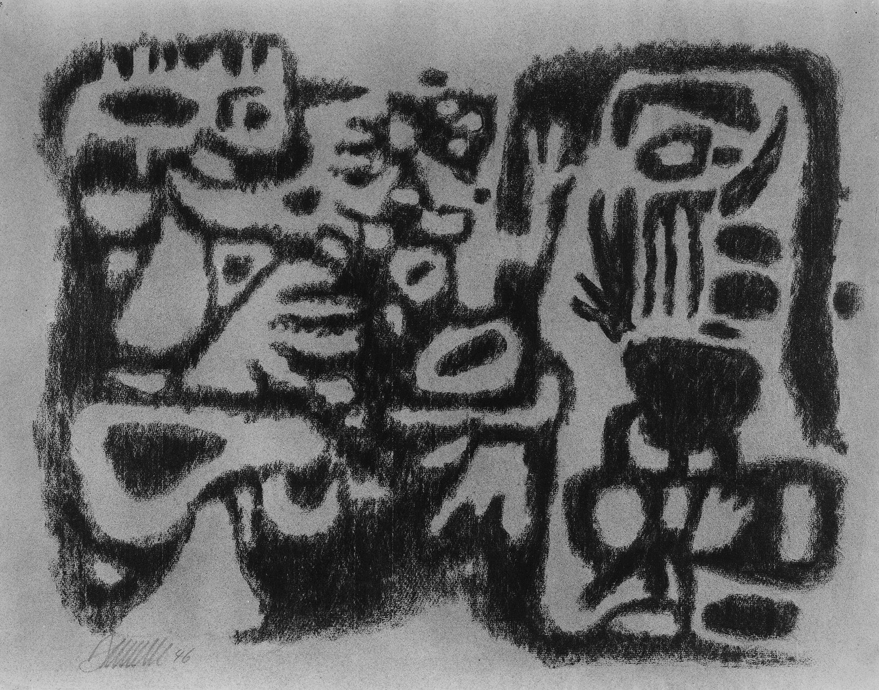 Kreide in Schwarz, fixiert, auf grauviolettem Ingres-Bütten mit Wz.: INGRES PMF