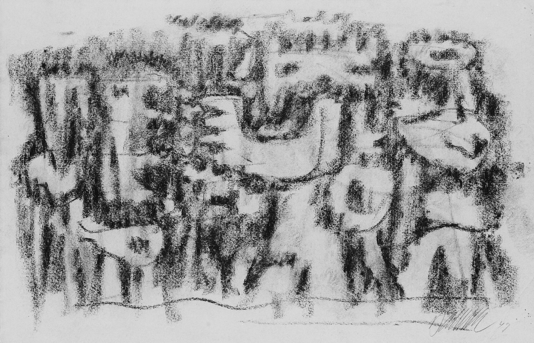 Kohle, gewischt, fixiert, auf beigefarbigem Ingres-Bütten, Wz. r. o.: PMF (ITALIA)